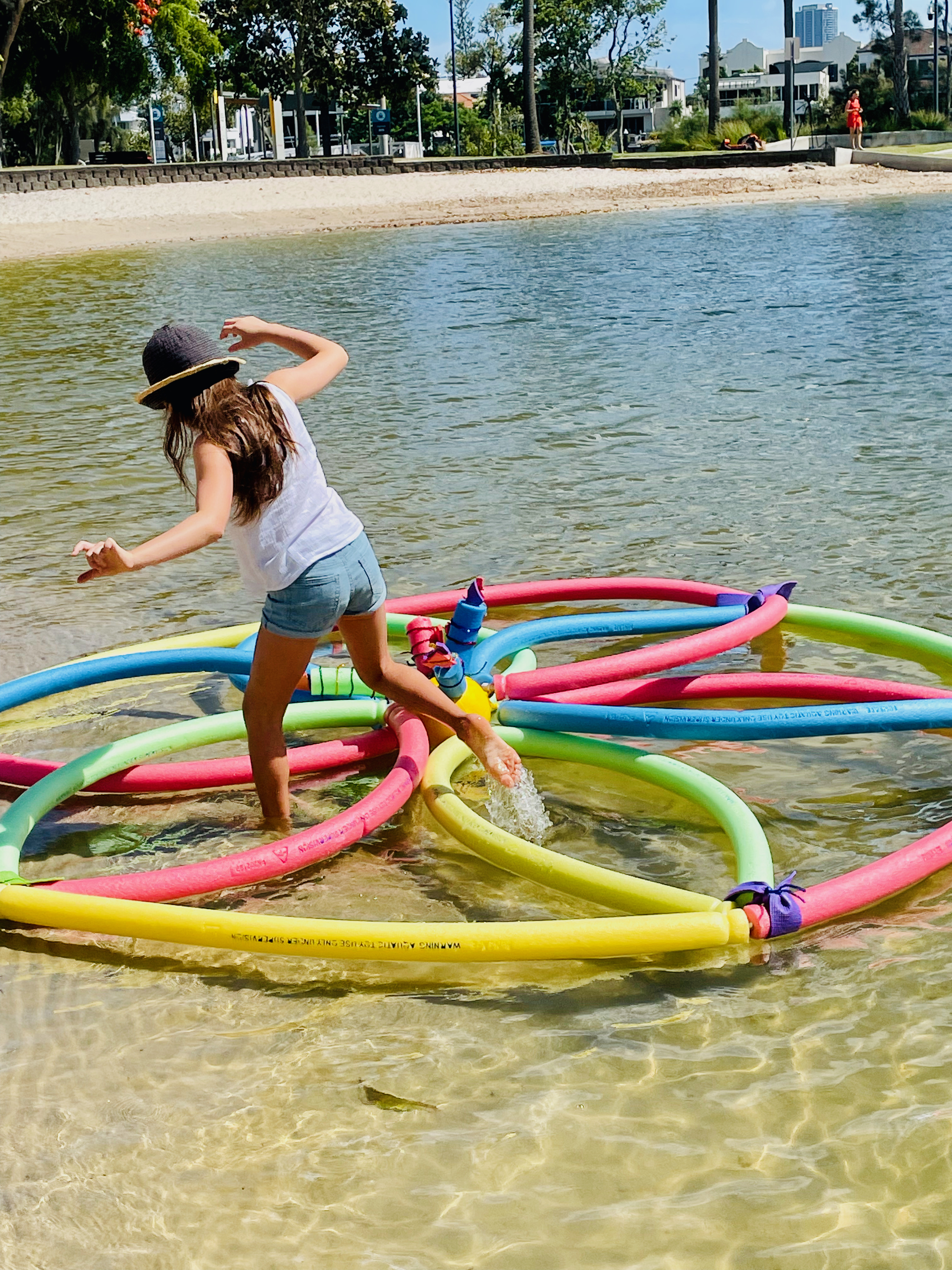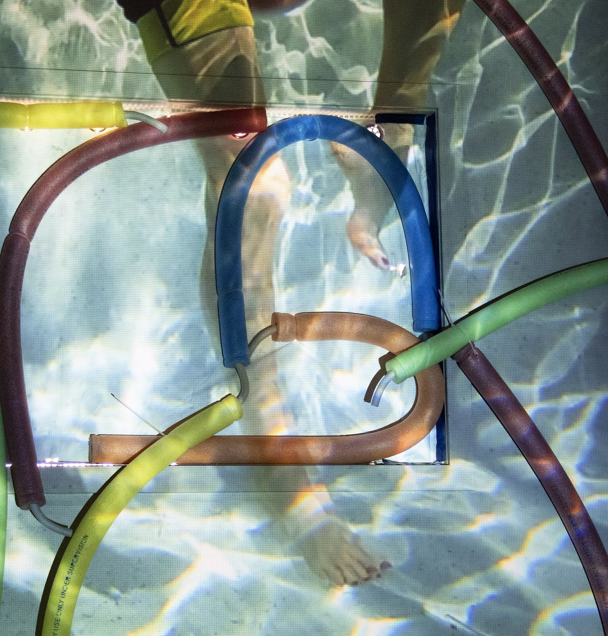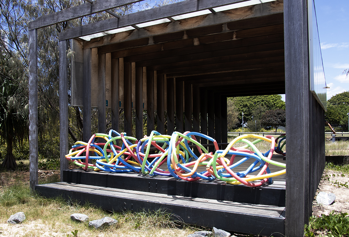 Further into the residency-I began exploring other locations further upstream. The areas below the Kangaroo Point Cliffs and the artificial pools at South Bank Parklands also afforded opportunities to explore how the contested sites of public leisure in Brisbane operate. Along the Kangaroo Point running and cycling tracks – I installed several pool noodles onto existing public art forms as a way of re interpreting these as new sculptures that feature both hard and soft graphic elements. At South Bank – the shallow children’s pool also became a site of interaction and an opportunity to experiment with new forms of imagery that is based on the push and pull of the noodle forms above and below the waterline.