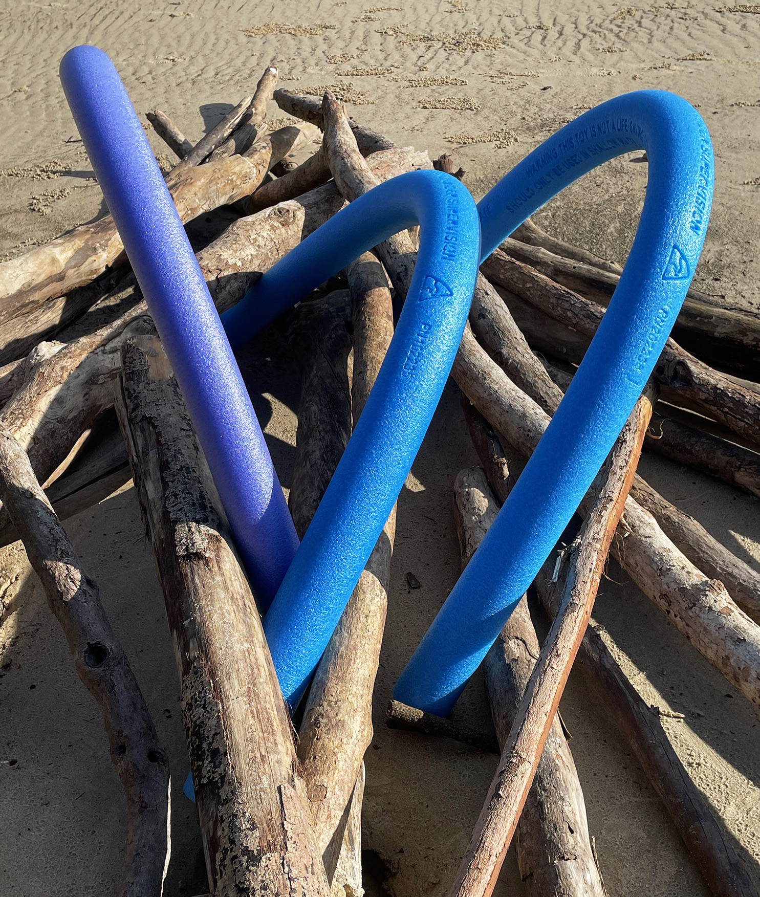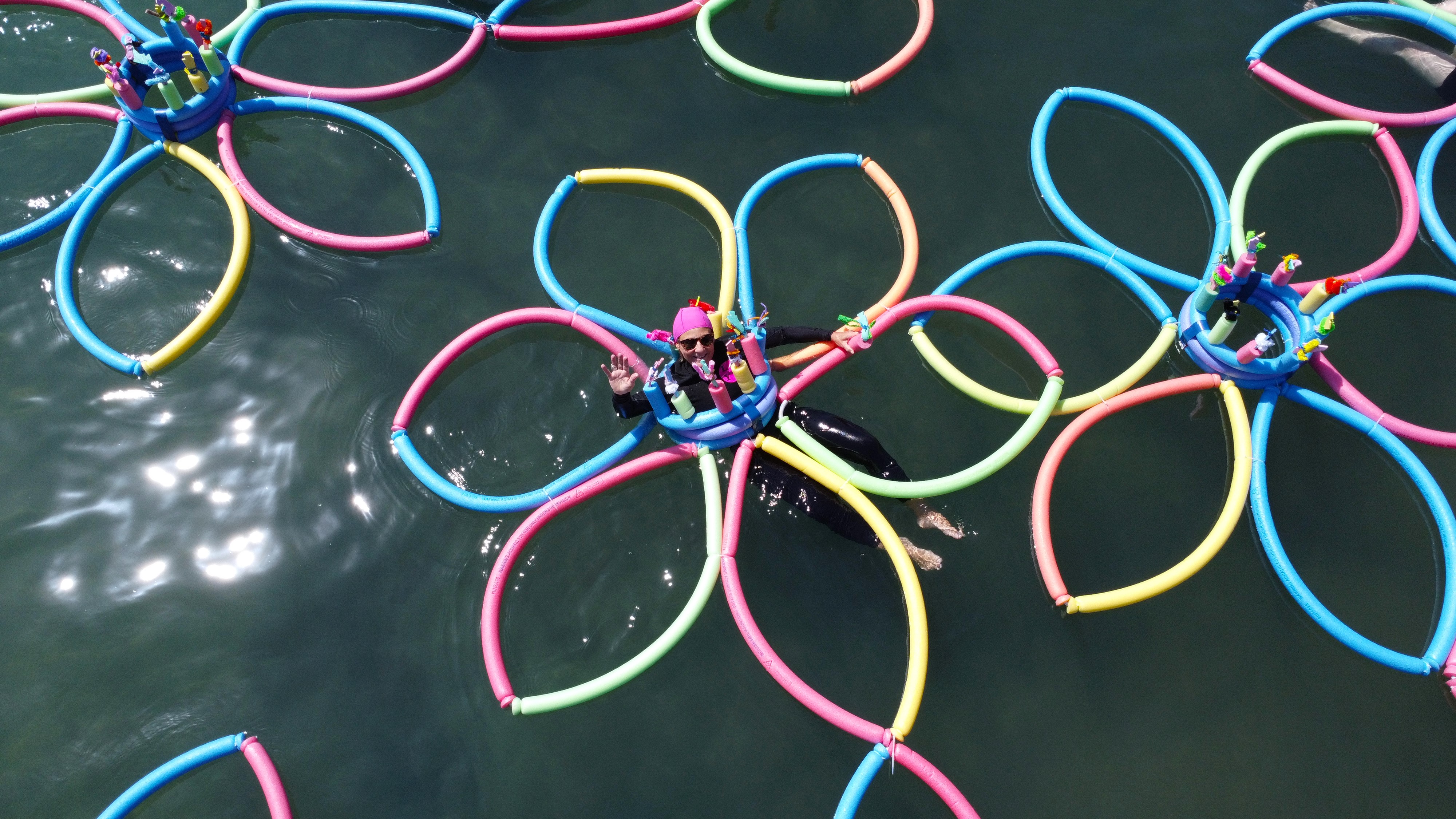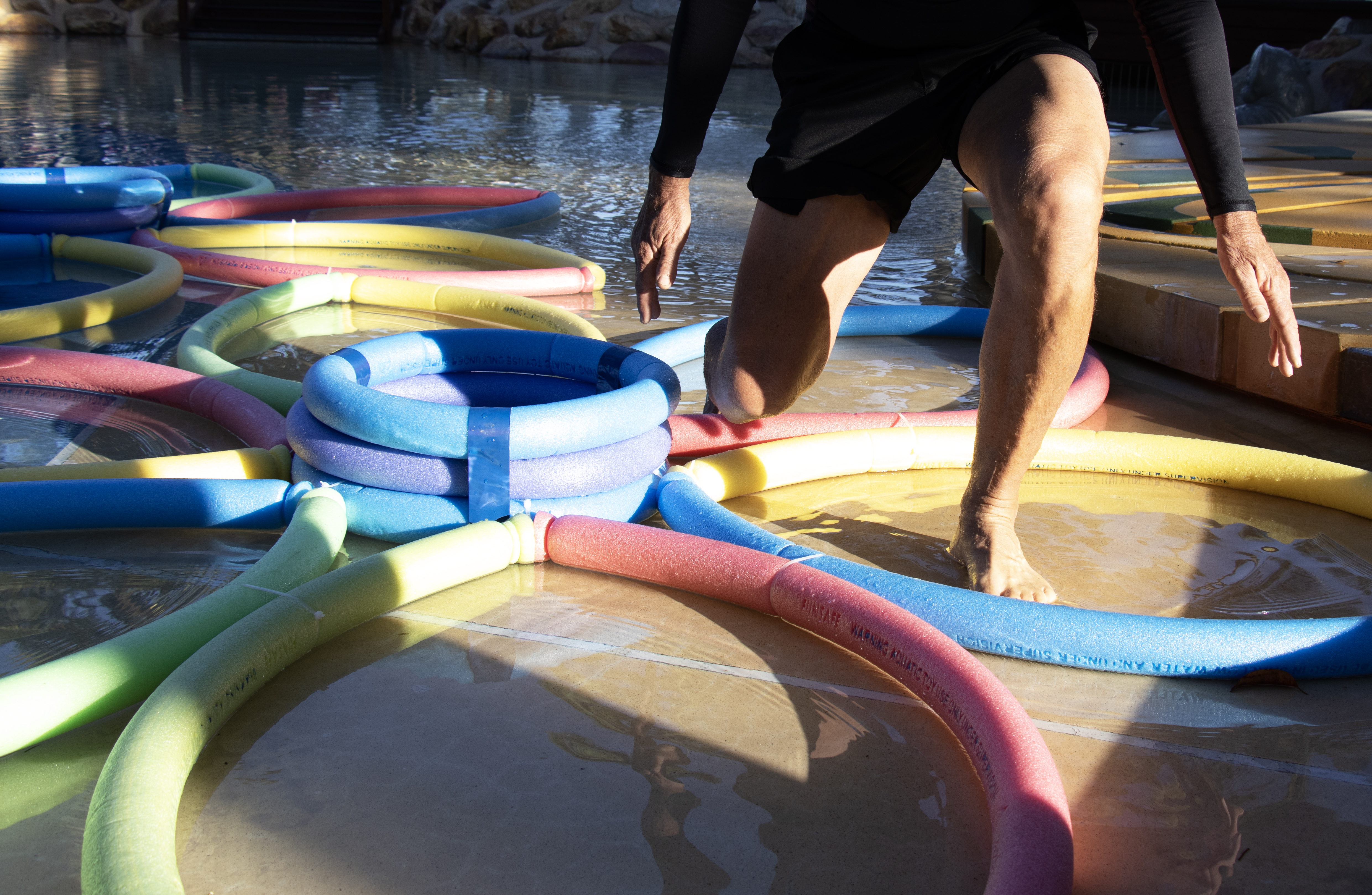 Further into the residency-I began exploring other locations further upstream. The areas below the Kangaroo Point Cliffs and the artificial pools at South Bank Parklands also afforded opportunities to explore how the contested sites of public leisure in Brisbane operate. Along the Kangaroo Point running and cycling tracks – I installed several pool noodles onto existing public art forms as a way of re interpreting these as new sculptures that feature both hard and soft graphic elements. At South Bank – the shallow children’s pool also became a site of interaction and an opportunity to experiment with new forms of imagery that is based on the push and pull of the noodle forms above and below the waterline.