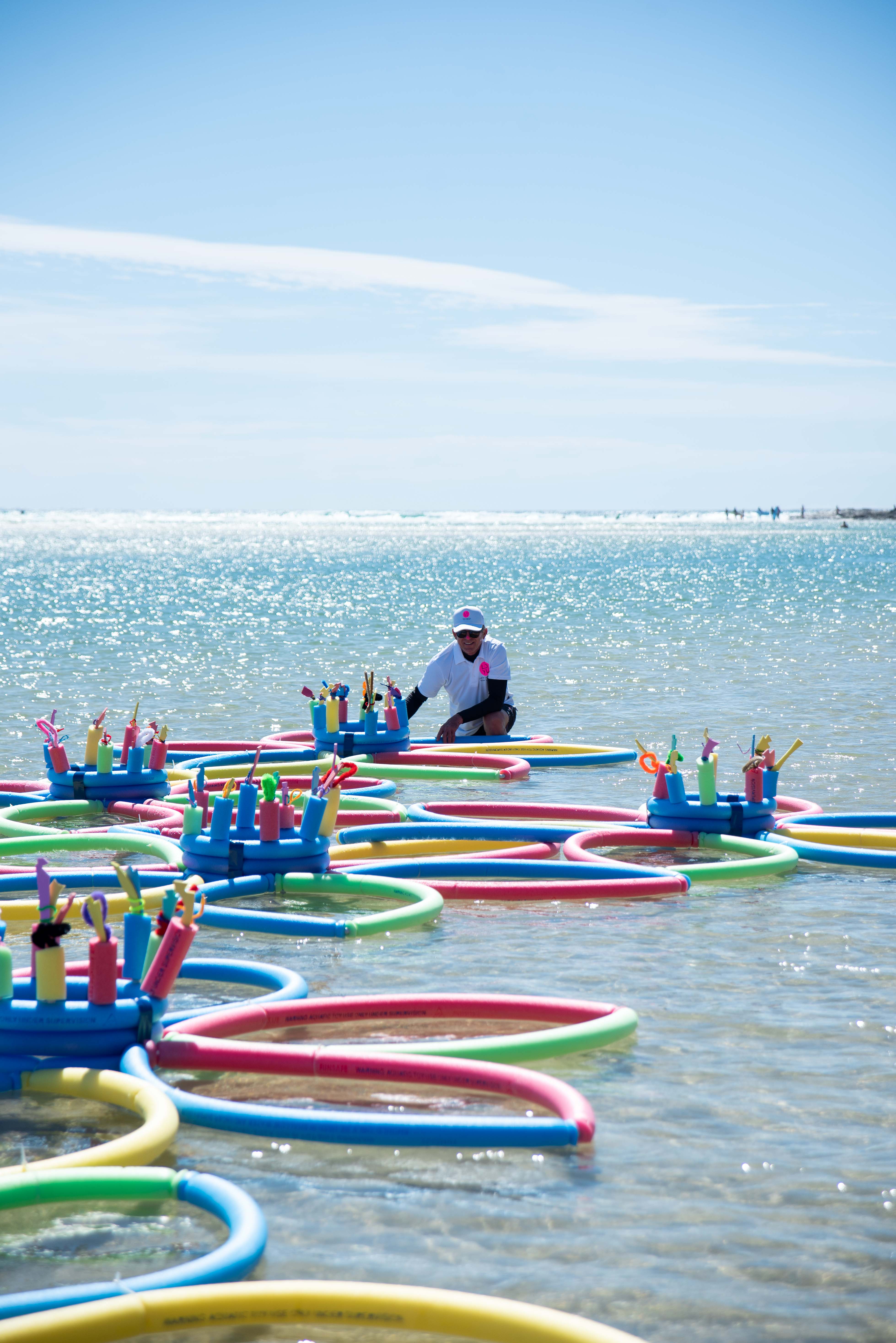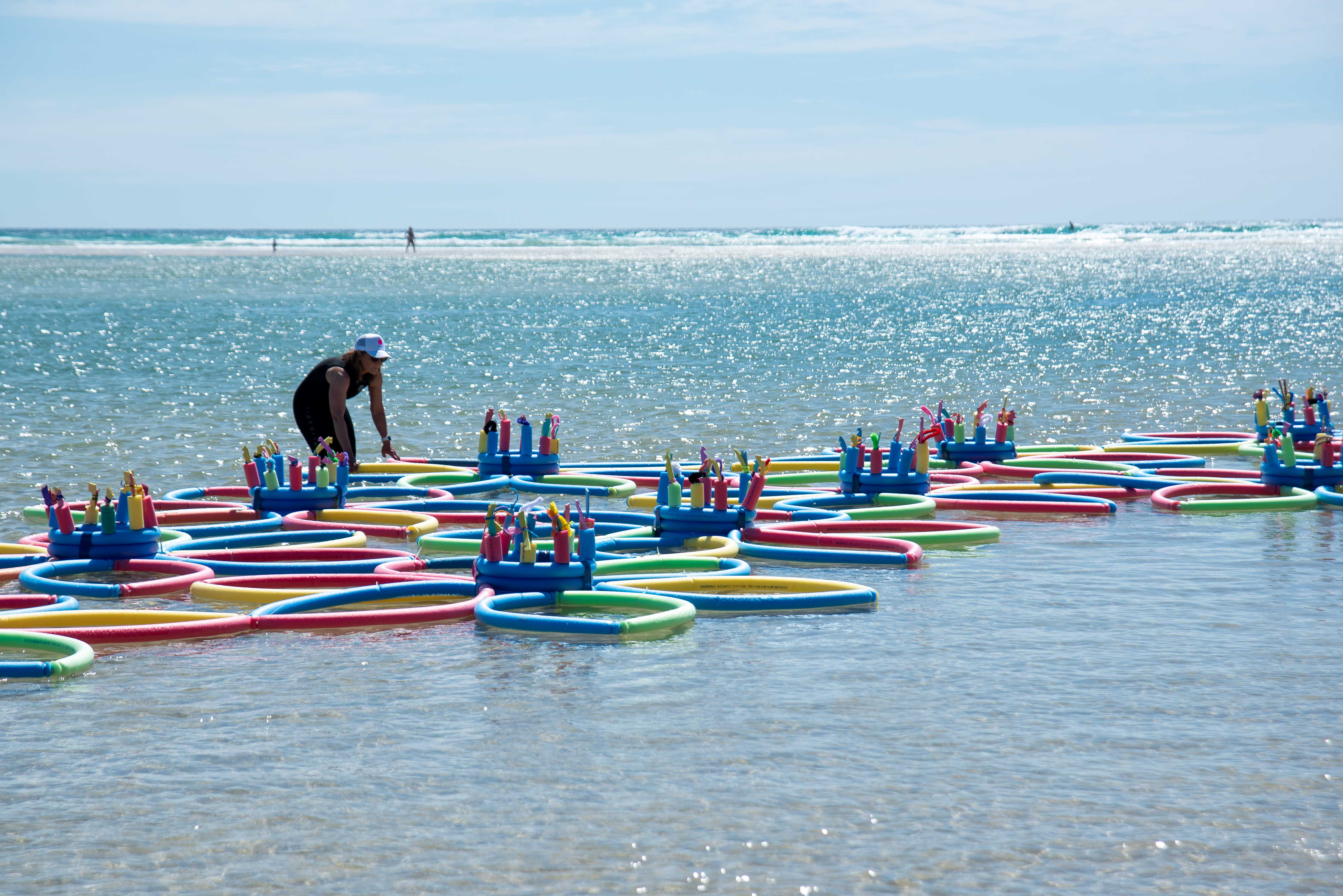 Working to a specific design brief , the participants respond to the site at the HOTA Lake , using materials we associate with “other” leisure activities. This allowed us to interacting with the lake itself – the shoreline and the body of water. Given that many people from all walks of life use the lake as a place of enjoyment and relaxation – involvement with members of the public became part of the work.