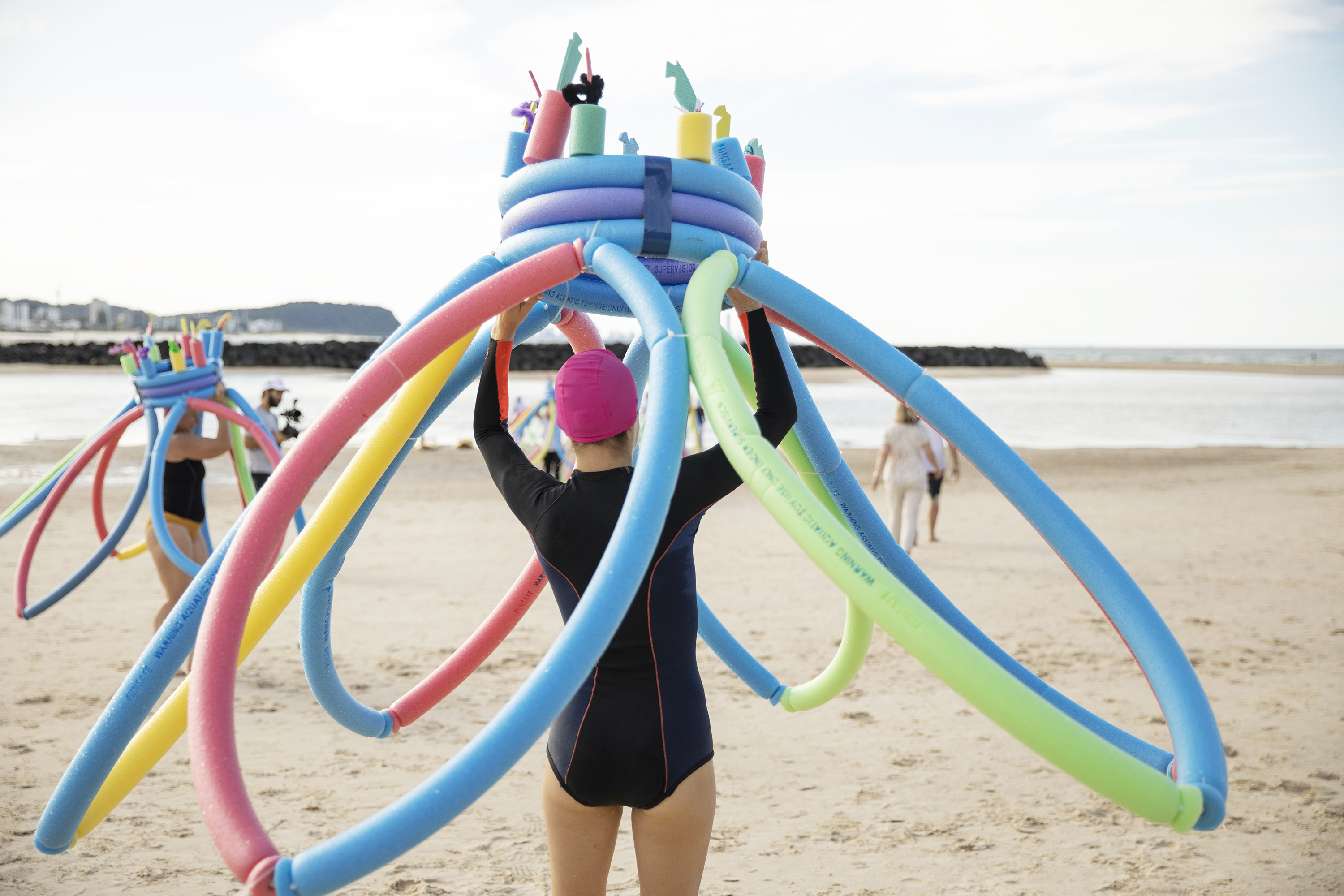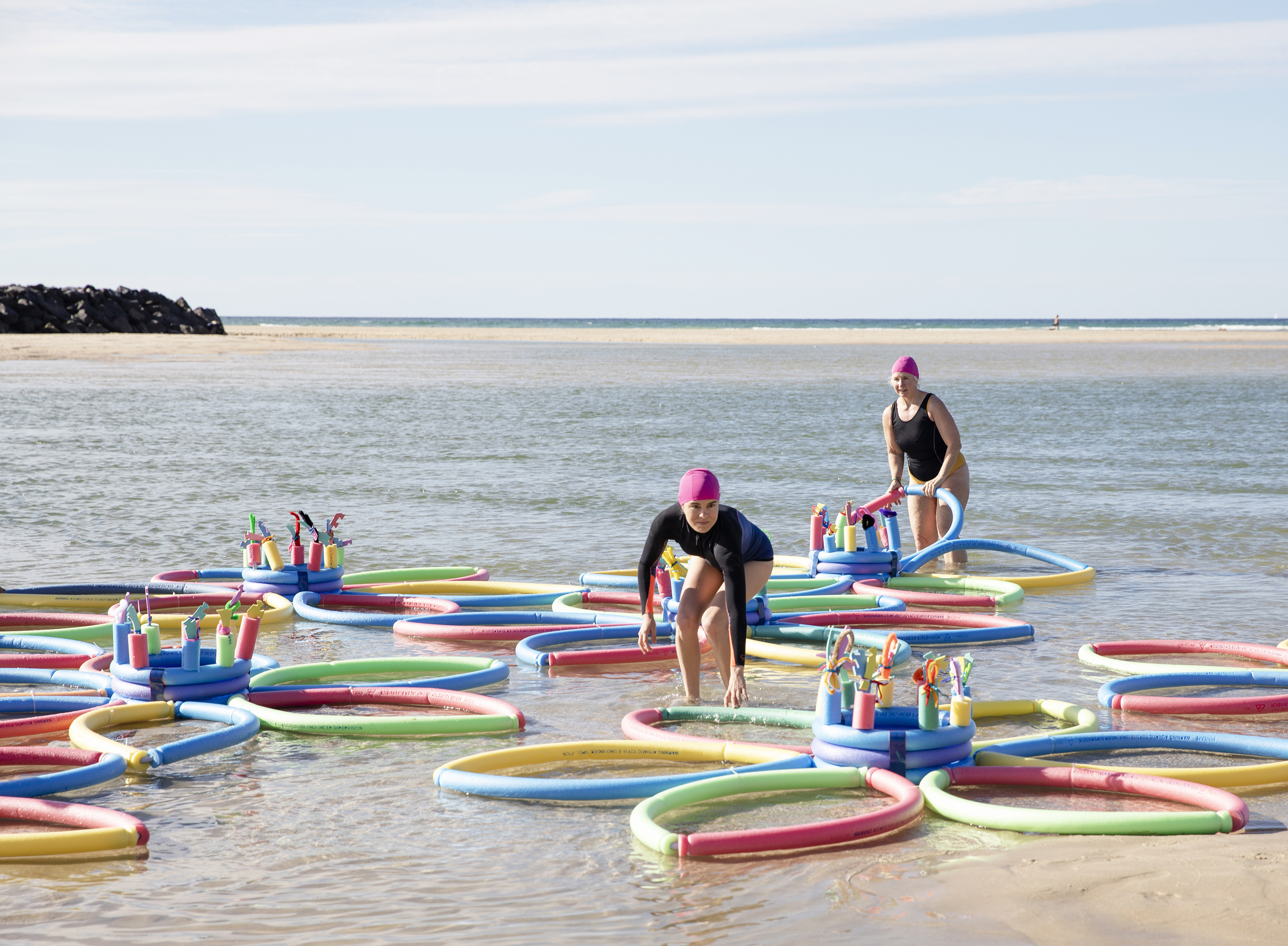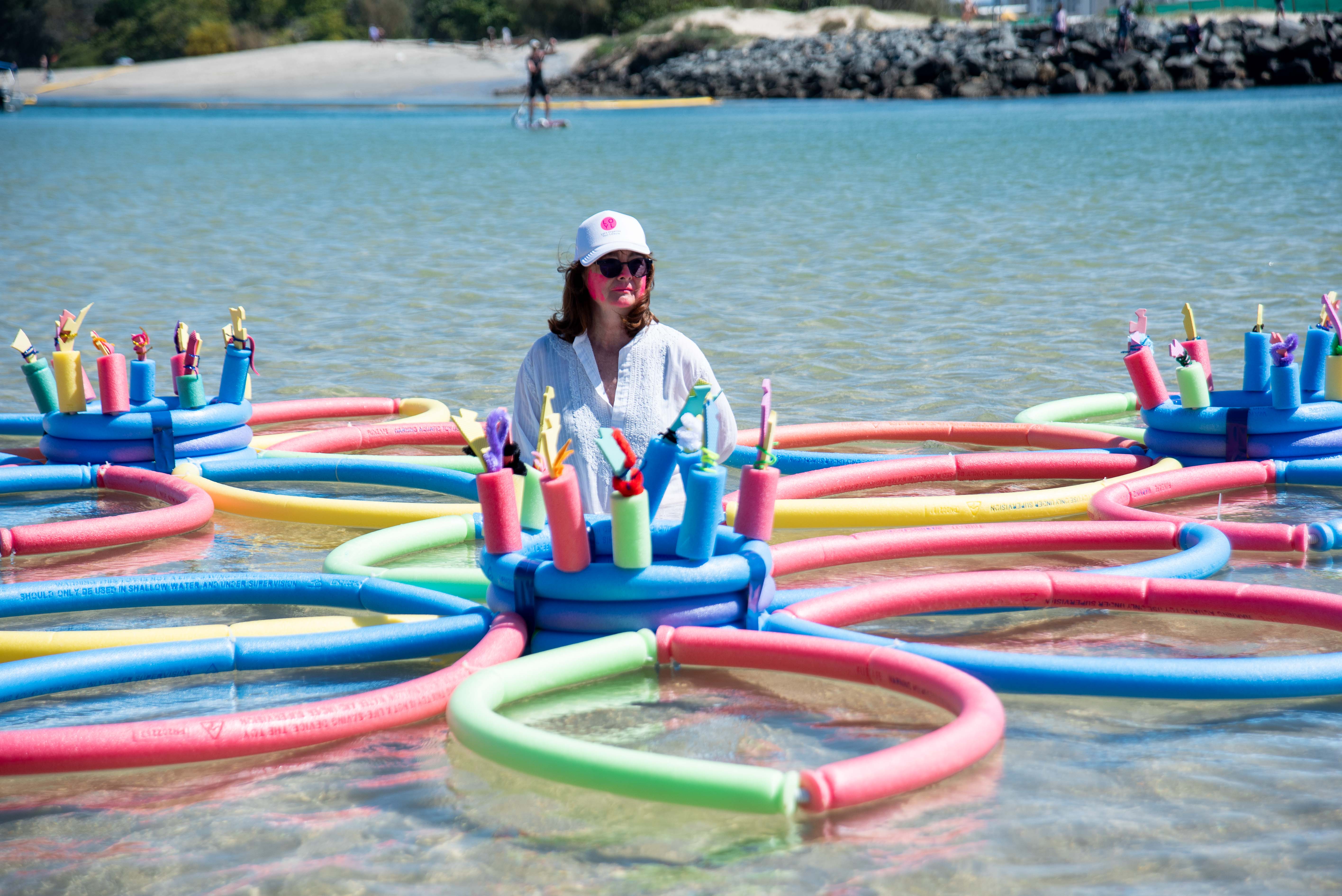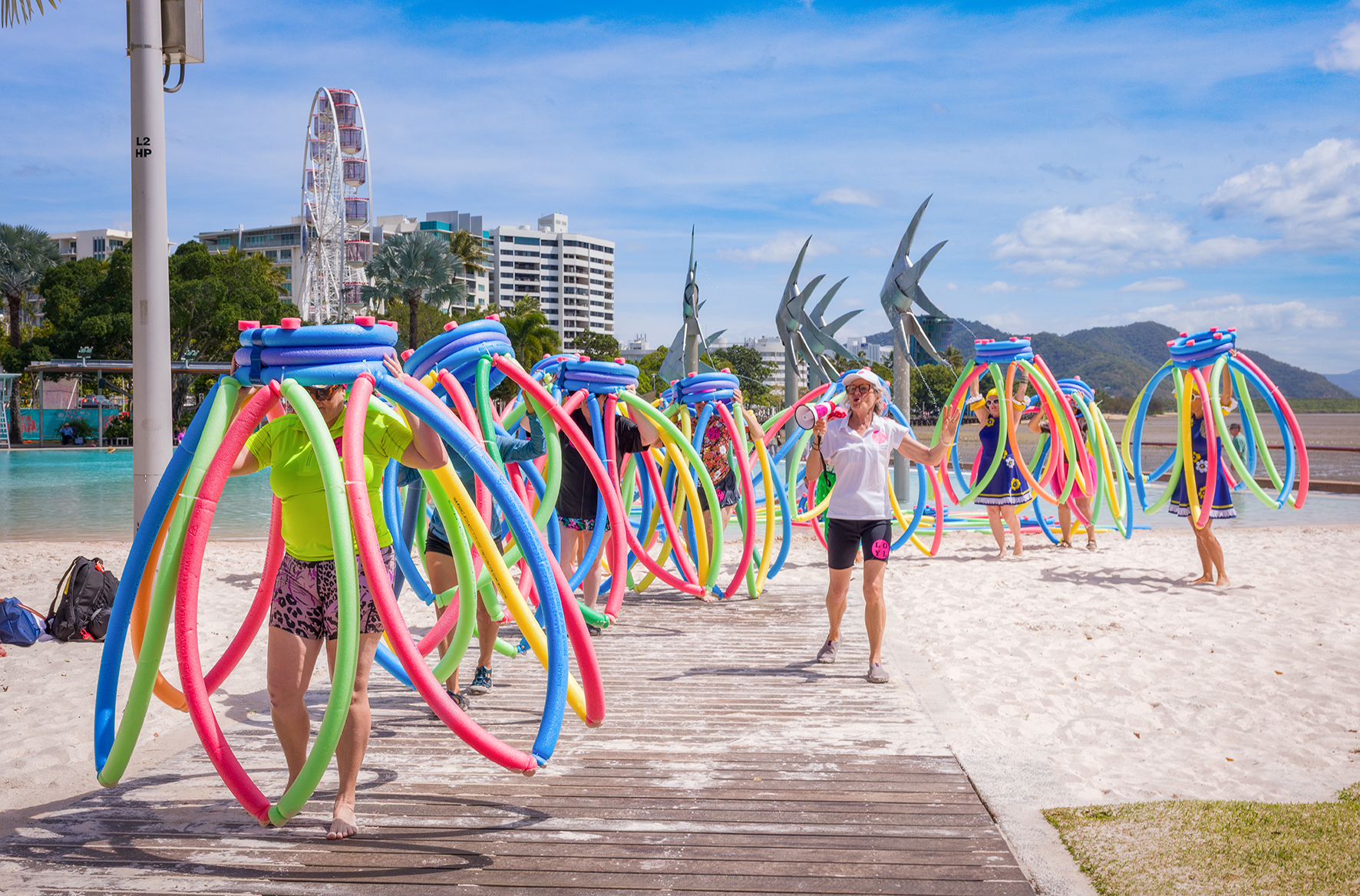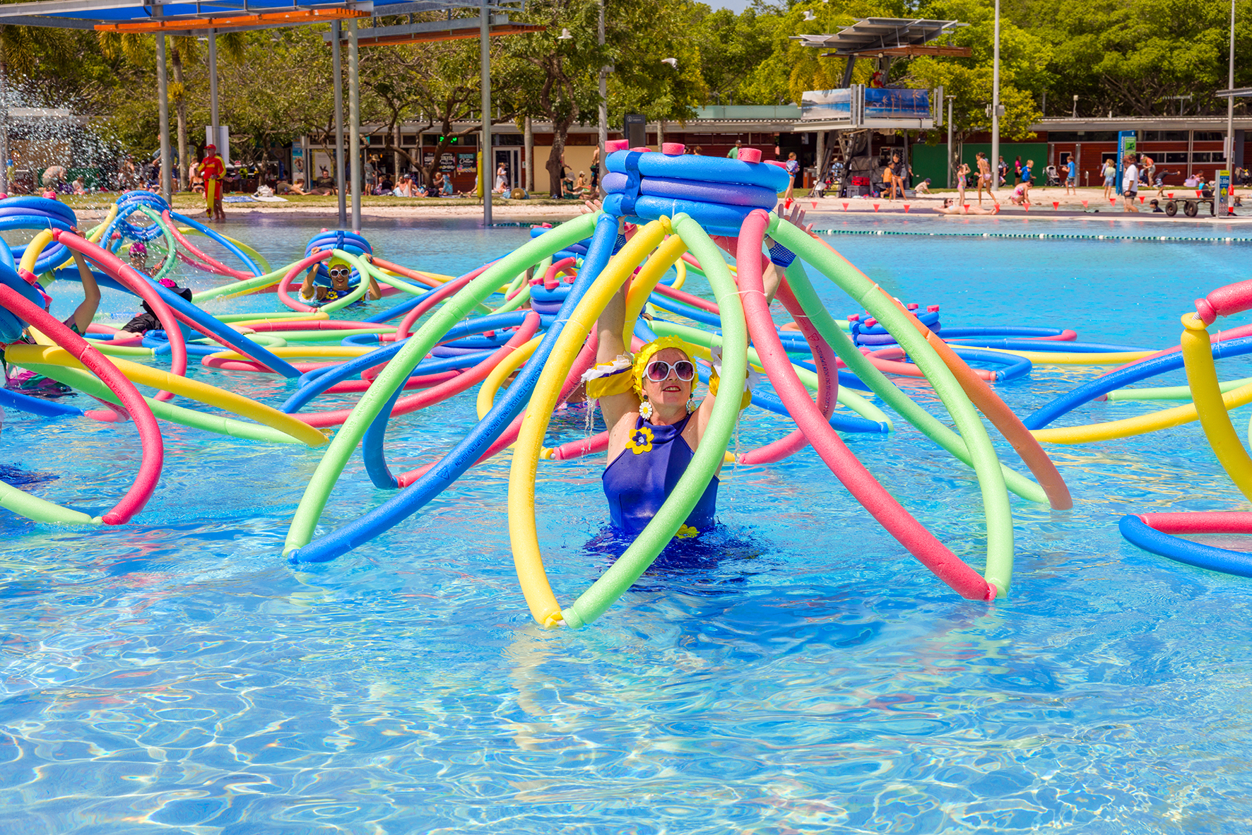 LOYL was presented for the first time outside Southeast Queensland at the Cairns Festival in August 2025. Again the presentation included a major site-specific artwork made from over 300 pool noodles – exploring assumptions about “organised leisure” for seniors and their allies. This time there was a greater focus on the processional elements moving in and out of the water- including simple moves such as squats and knee bends cued by myself leading an “exercise class”. Through the movements the group was able to emulate references to soldier crabs marching across the sand and into the water again referencing the performance aspects of the work to the natural world.