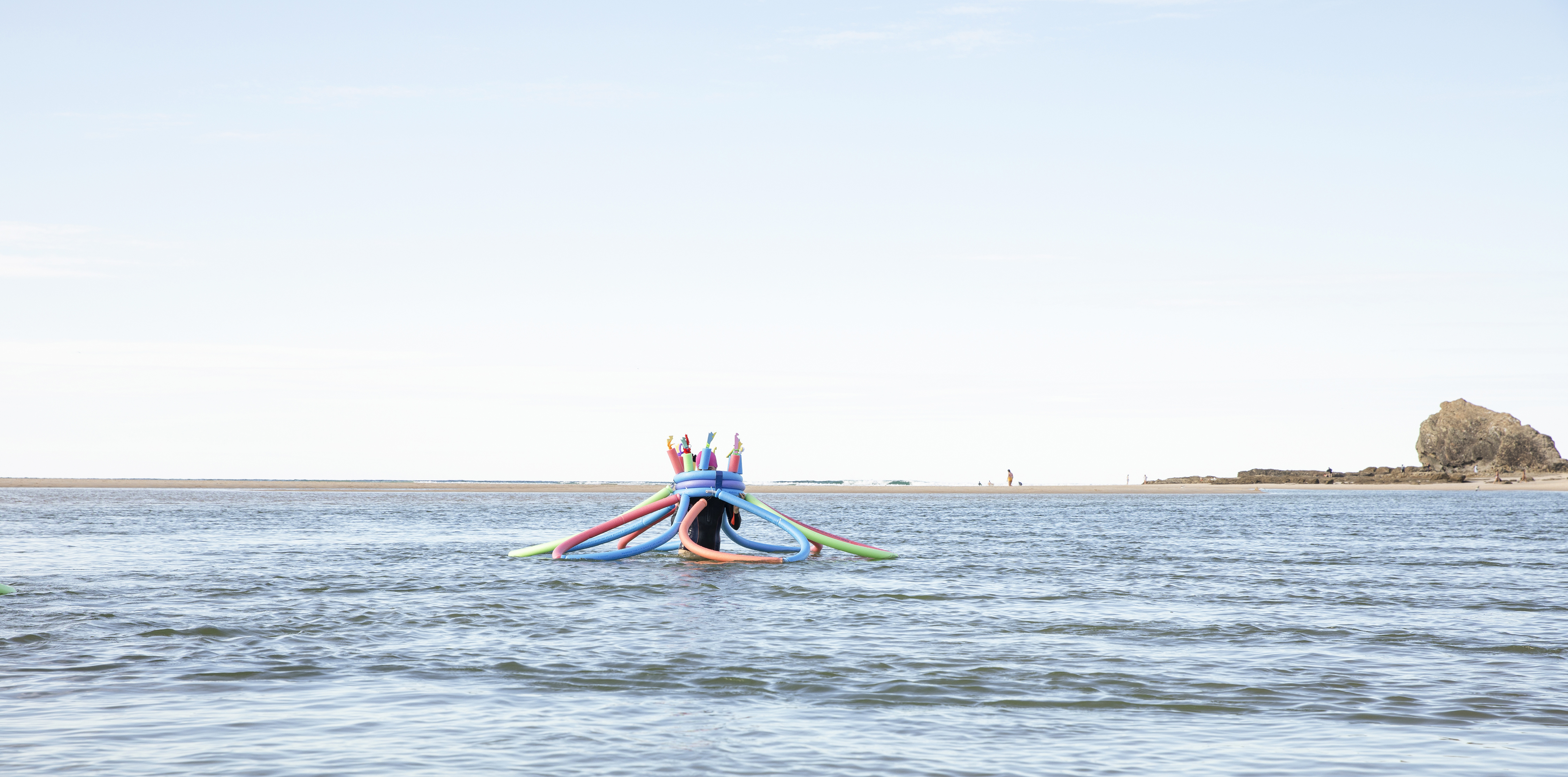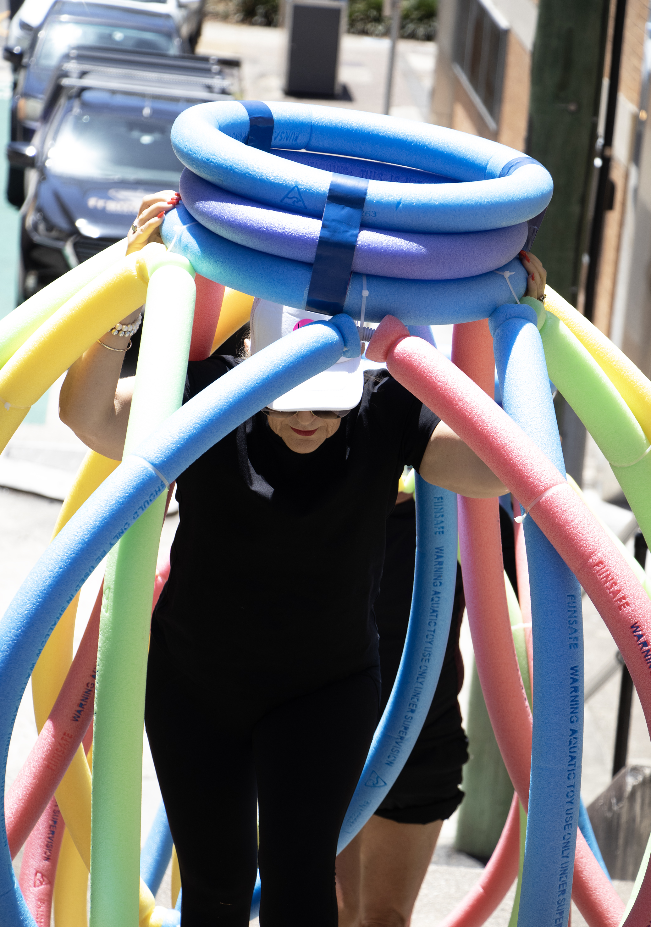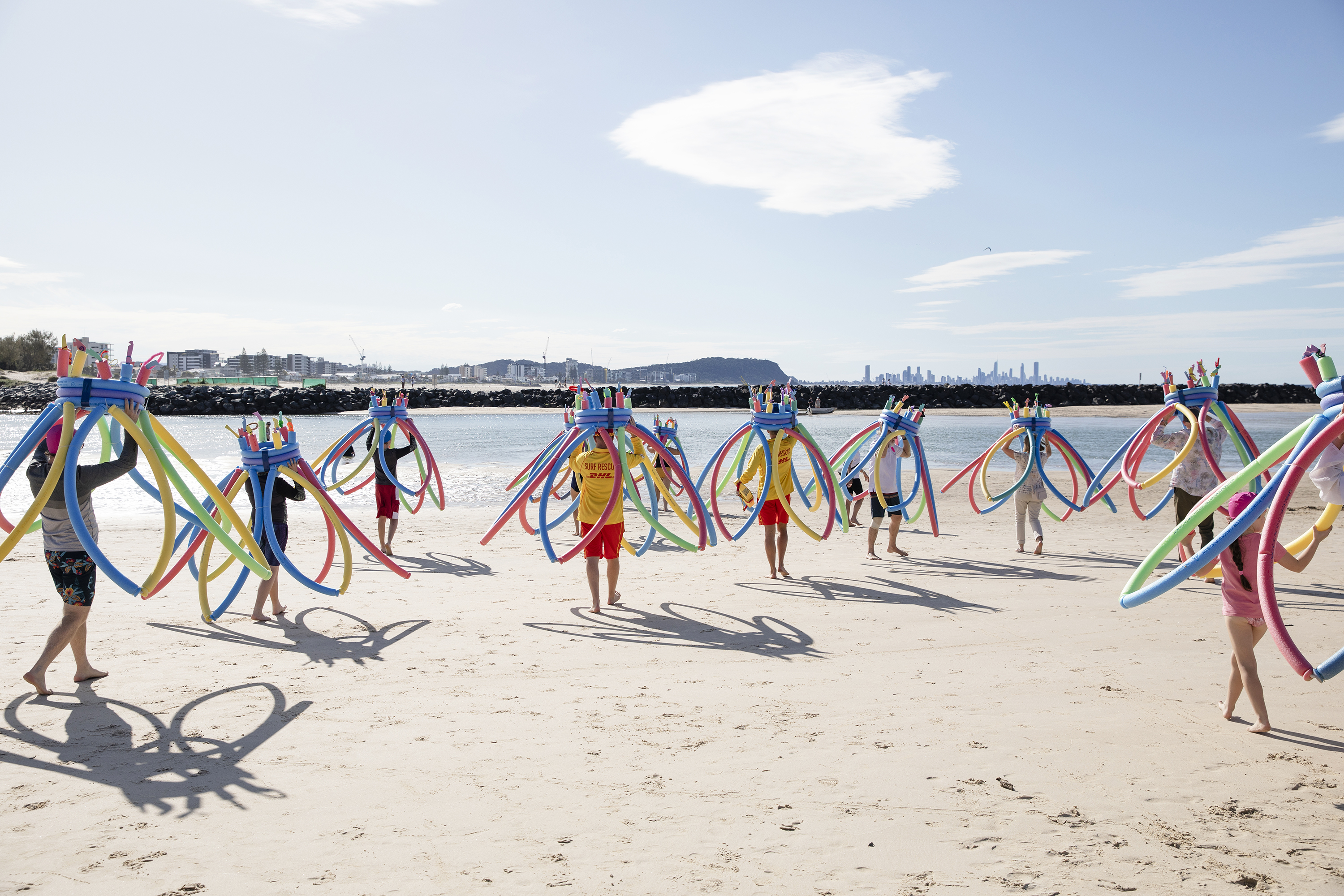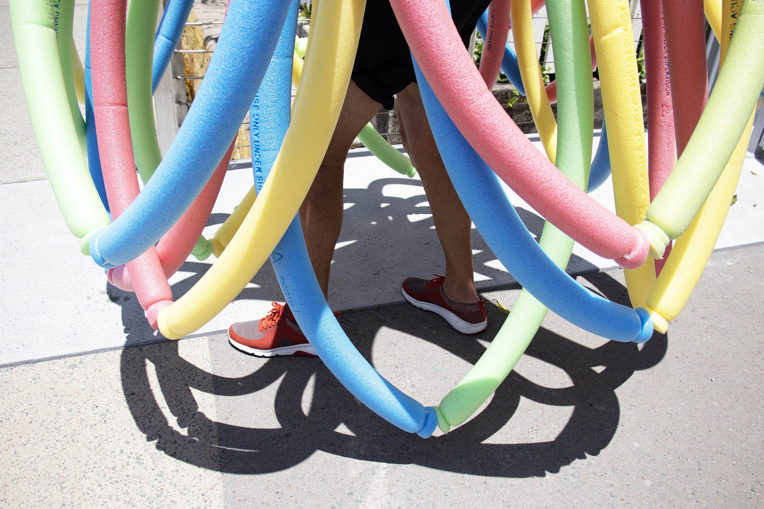 The location along the Brisbane River offered some very strategic opportunities to explore the concepts of public/ private space and behaviours associated with the commodification of leisure and the intersection of art and sport. The public pontoon at the Powerhouse and the boardwalks along the river through New Farm Park and the Submariners Walk Heritage Trail were interrogated by introducing the performative elements of the human body and the pool noodles as artefacts of leisure.