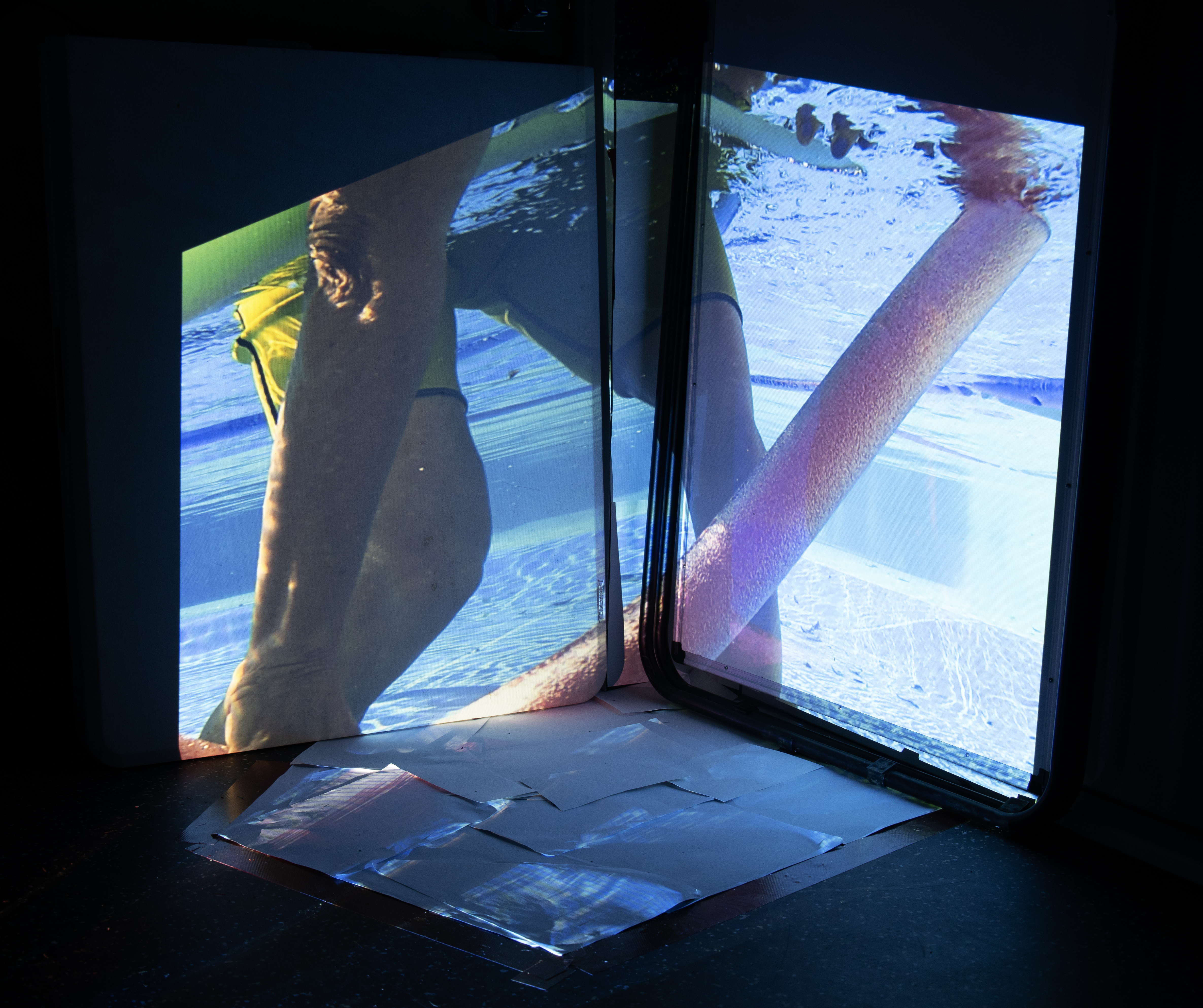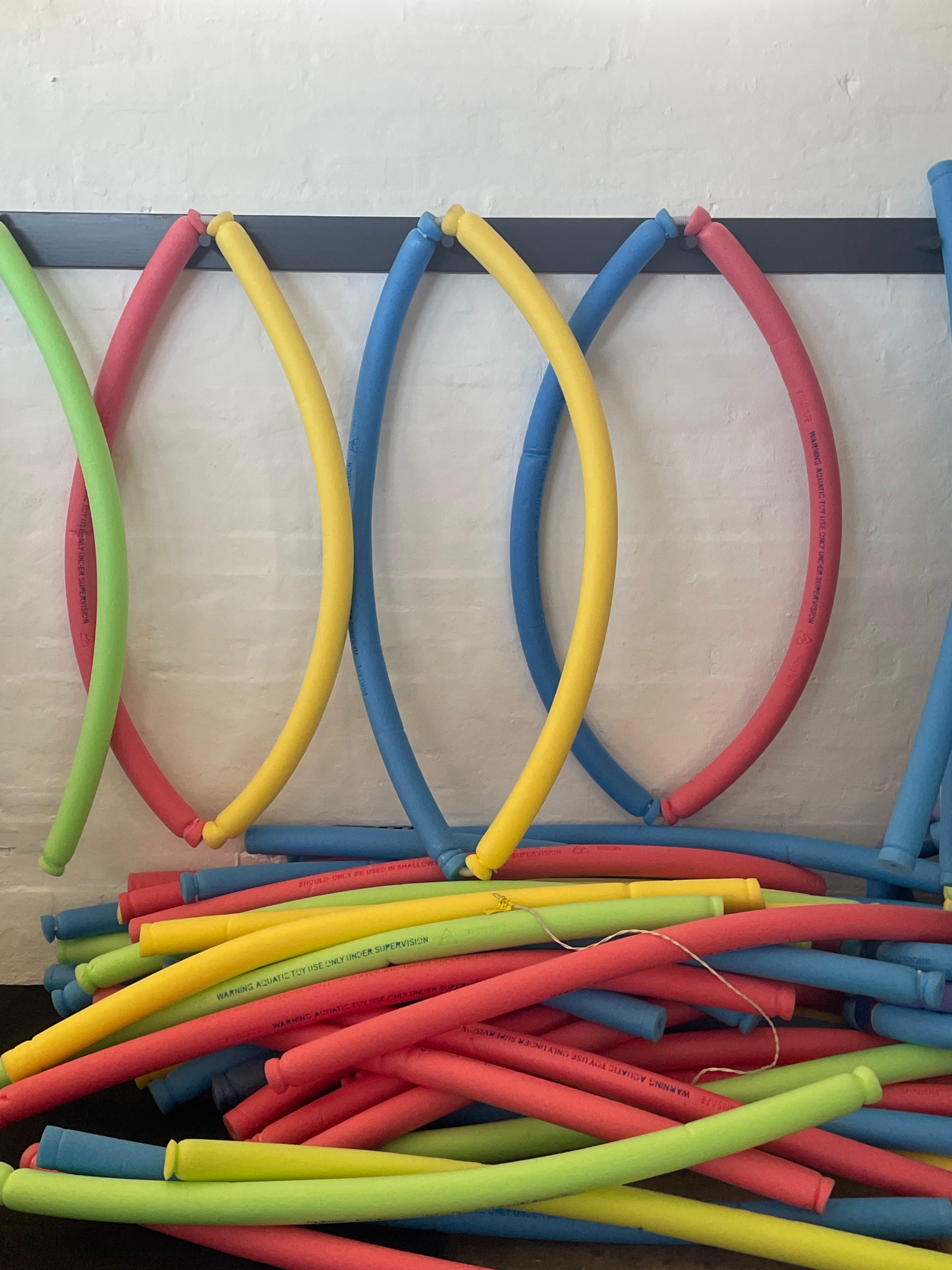 The creation of a projection studio purposely set up a dialogue between image and object. By using the pool noodles attached to the wall as a form of gestural drawing frieze- I was able to create a spatial juxtaposition between those objects the actual projection videos. I intend to further exploit this technique at greater scale and using multiple channels to create a more immersive experience in future works.
