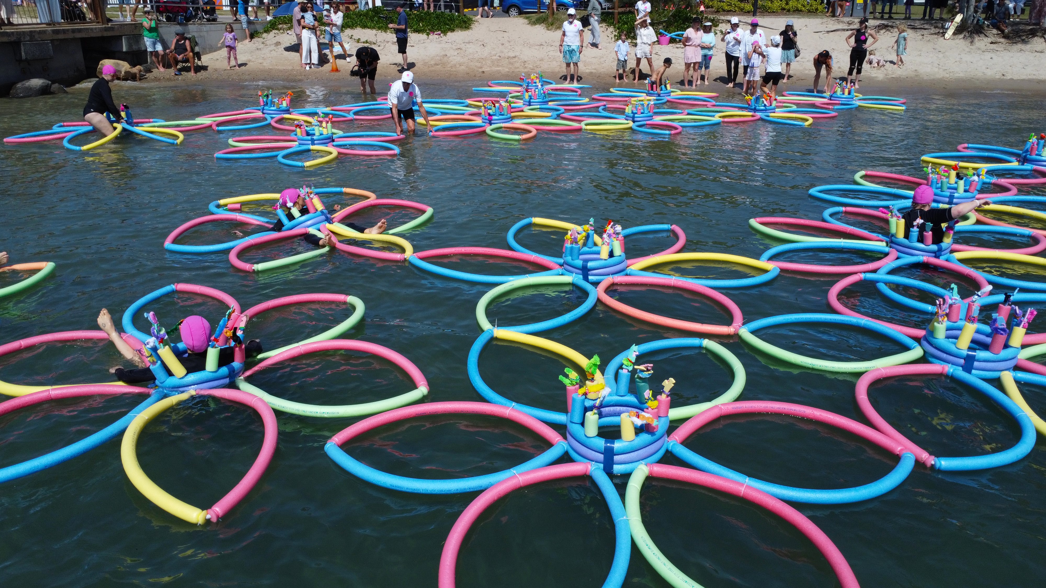 Working as a small team (including support artists dressed in LOYL branded outfits)we conducted preparatory workshops which then culminated in a public program commissioned by HOTA in January 2022. This consisted of 3 morning workshops and a Float off Finale – where 10 components were launched into the lake as an installation. This final work also included several participants swimming and floating within the piece.