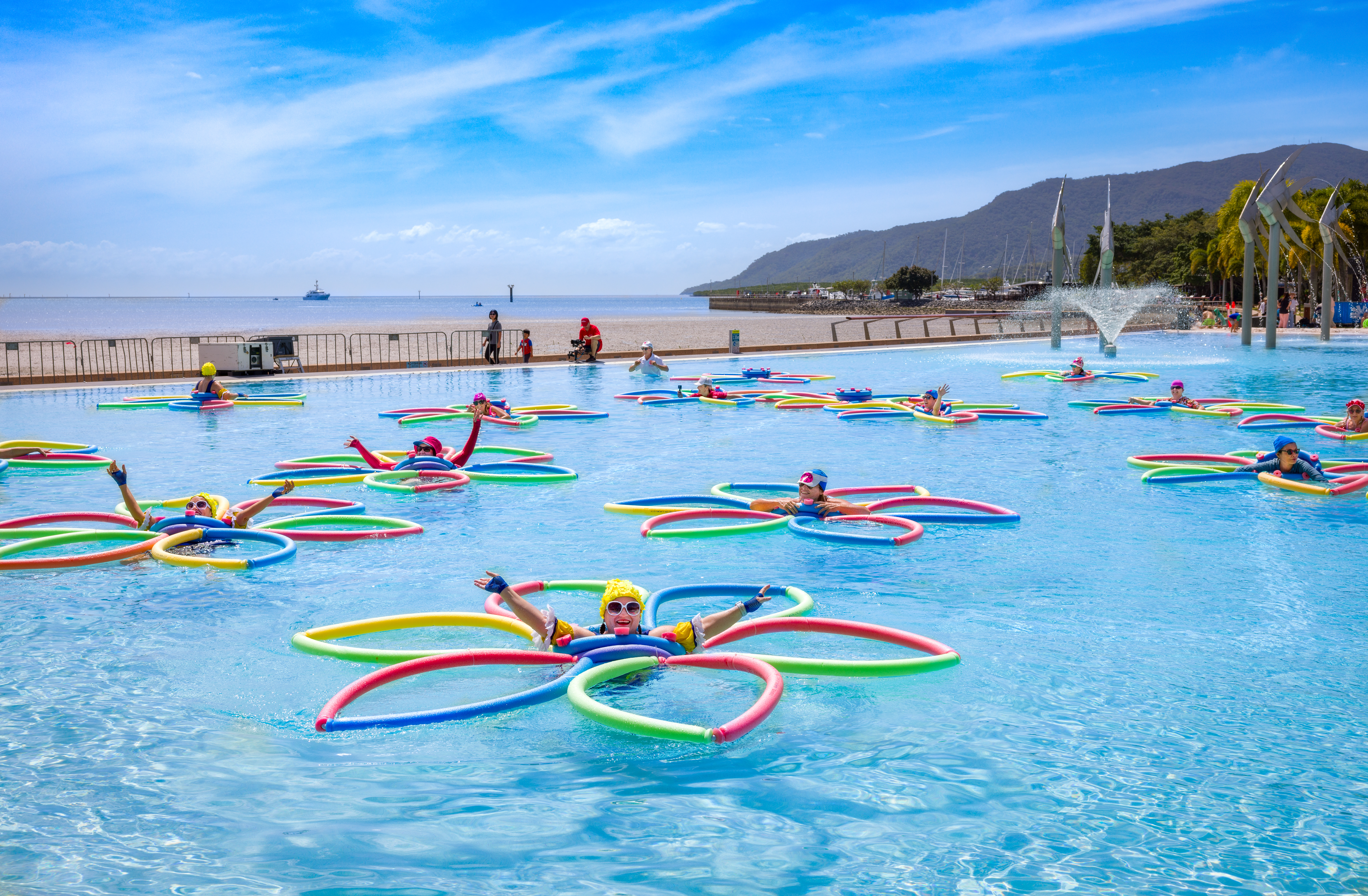 The site was ideal – as the creative team was able to access the man-made Cairns Esplanade Lagoon which not only provided a highly visual place to work , but also a site that embraced the irony of locating man-made places of public leisure very close to a natural waterway. The Lagoon is an iconic location in Cairns – a site that is very popular with locals and tourists alike. Actively patrolled by lifeguards in their bright red and yellow uniforms – it is also used for a range of actual leisure activities such as yoga and aqua zumba. Through the support of the Cairns Regional Council – I was able to collaborate with a local dance group, the Sassy Catz, whose tongue in cheek humour and strong movement leadership made a great contribution to the presentation. It also offered the opportunity to invest in local creative talent. The Cairns Festival presentation was the most successful in attracting the target audience of “seniors” who clearly embraced the spirit of the performance and added to the ongoing narrative and community of LOYL squad members along the Queensland coastline.