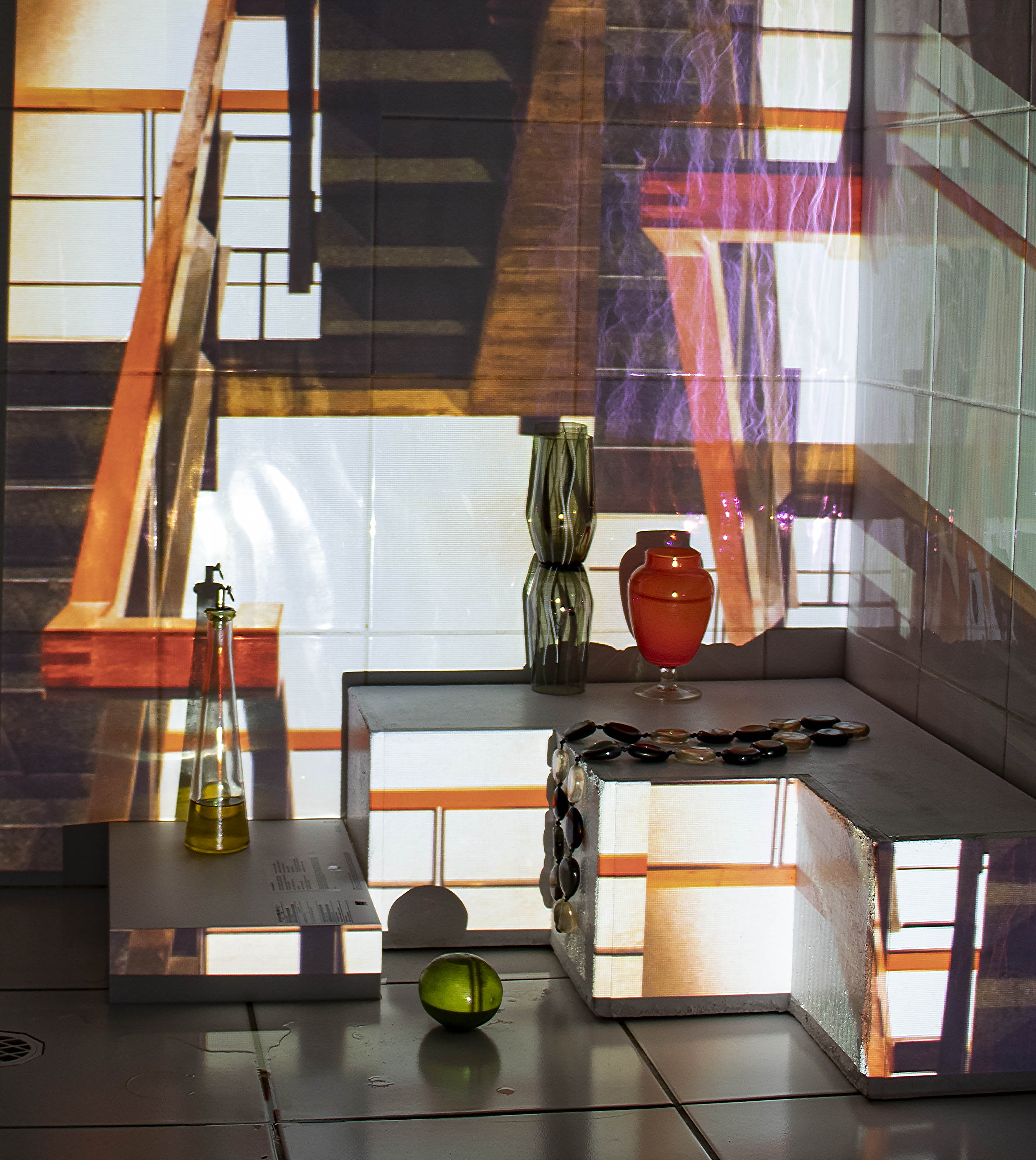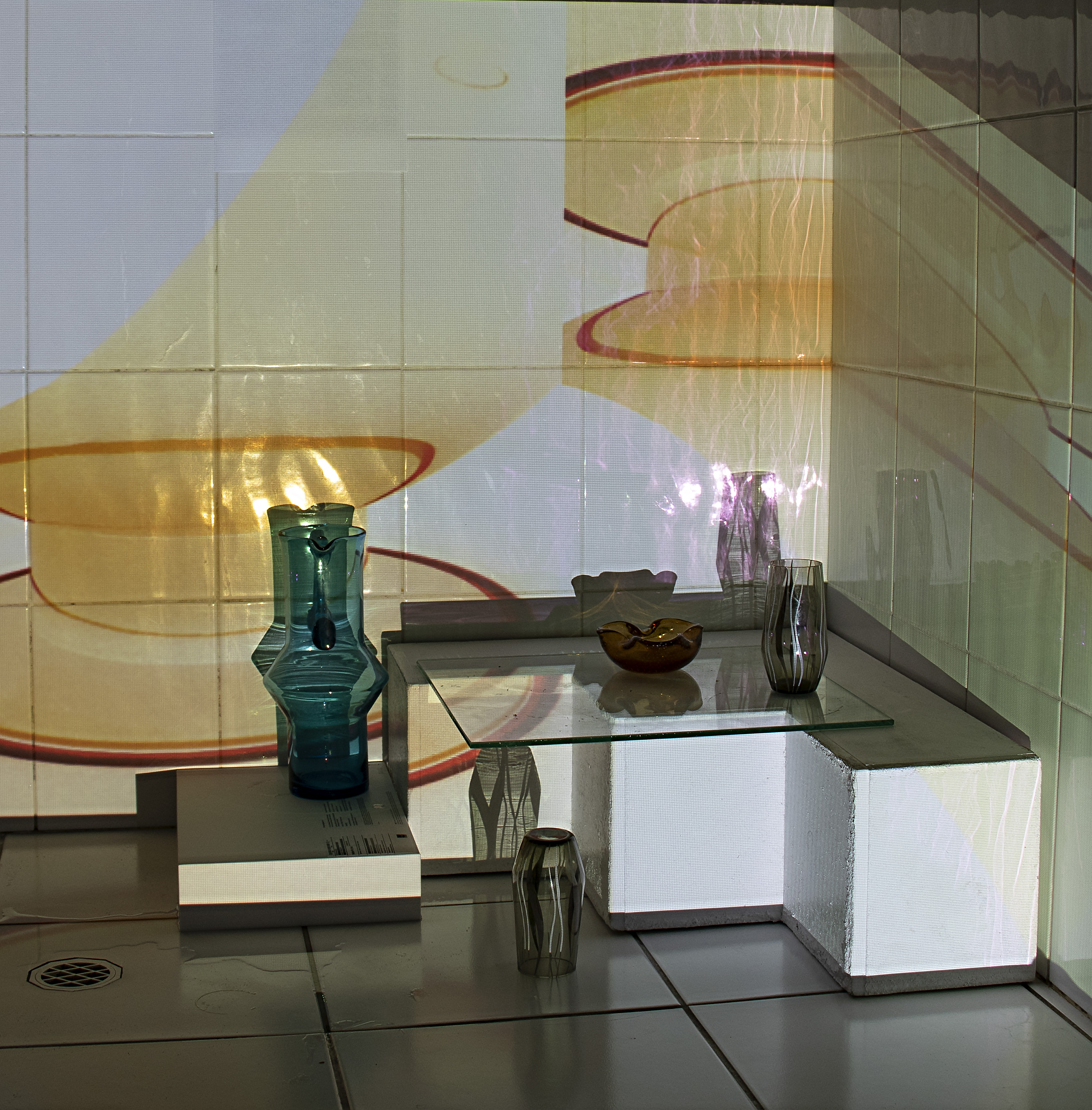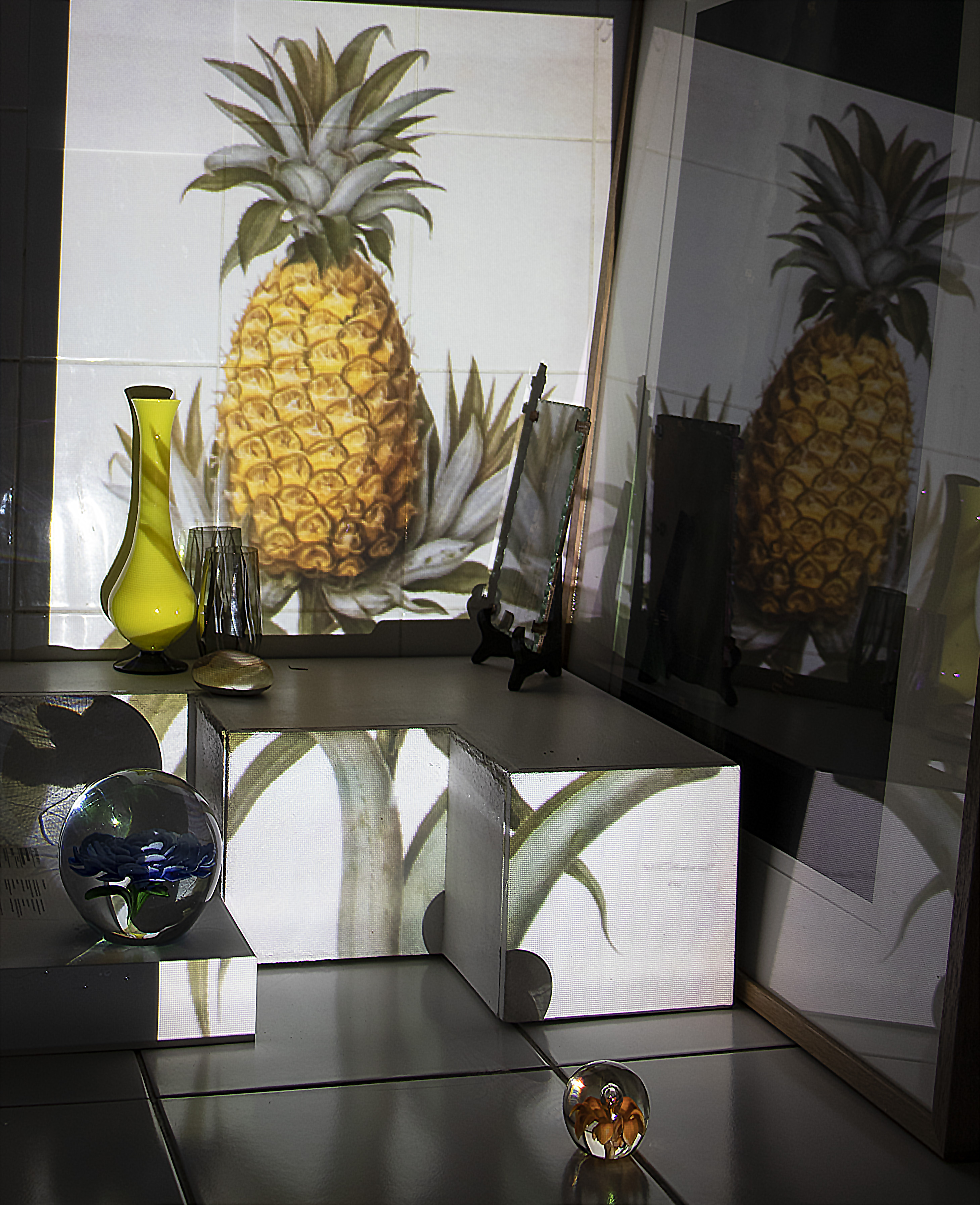 Sitting alongside the more abstracted works are those inspired by my interactions with 20th century sculpture. The energetic volumes, voids and shapes of Calder, Judd and Matta-Clarke are of particular interest as when these images are projected into a corner they take on another layer of spatiality. My experiments with sculptural and/or architectural images when combined with more domestically scaled objects have become part of my signature within this broader body of work.