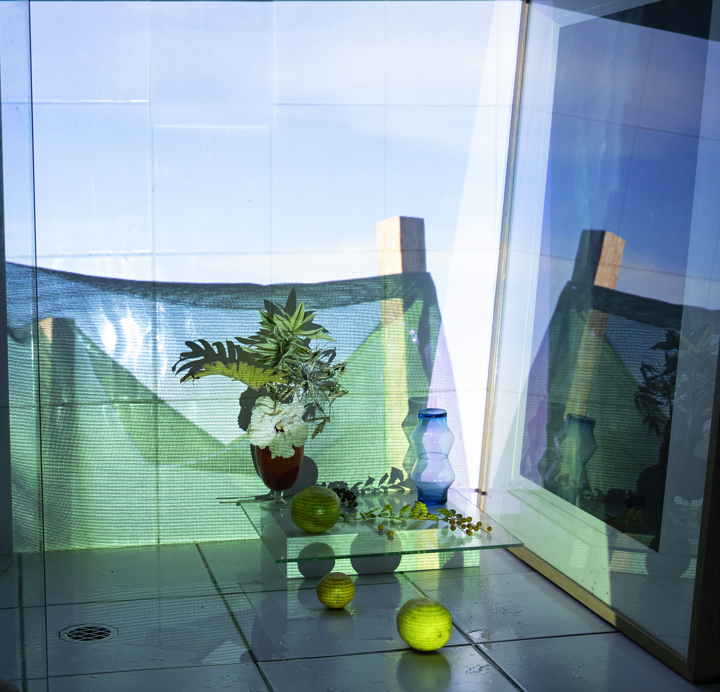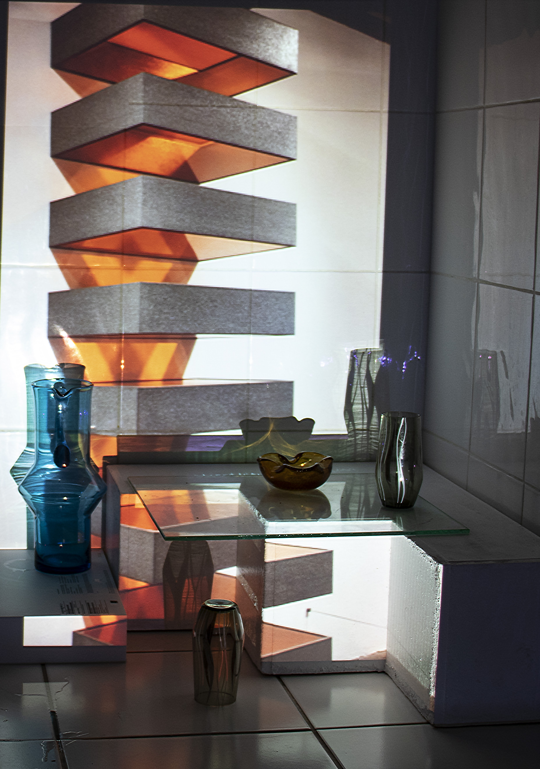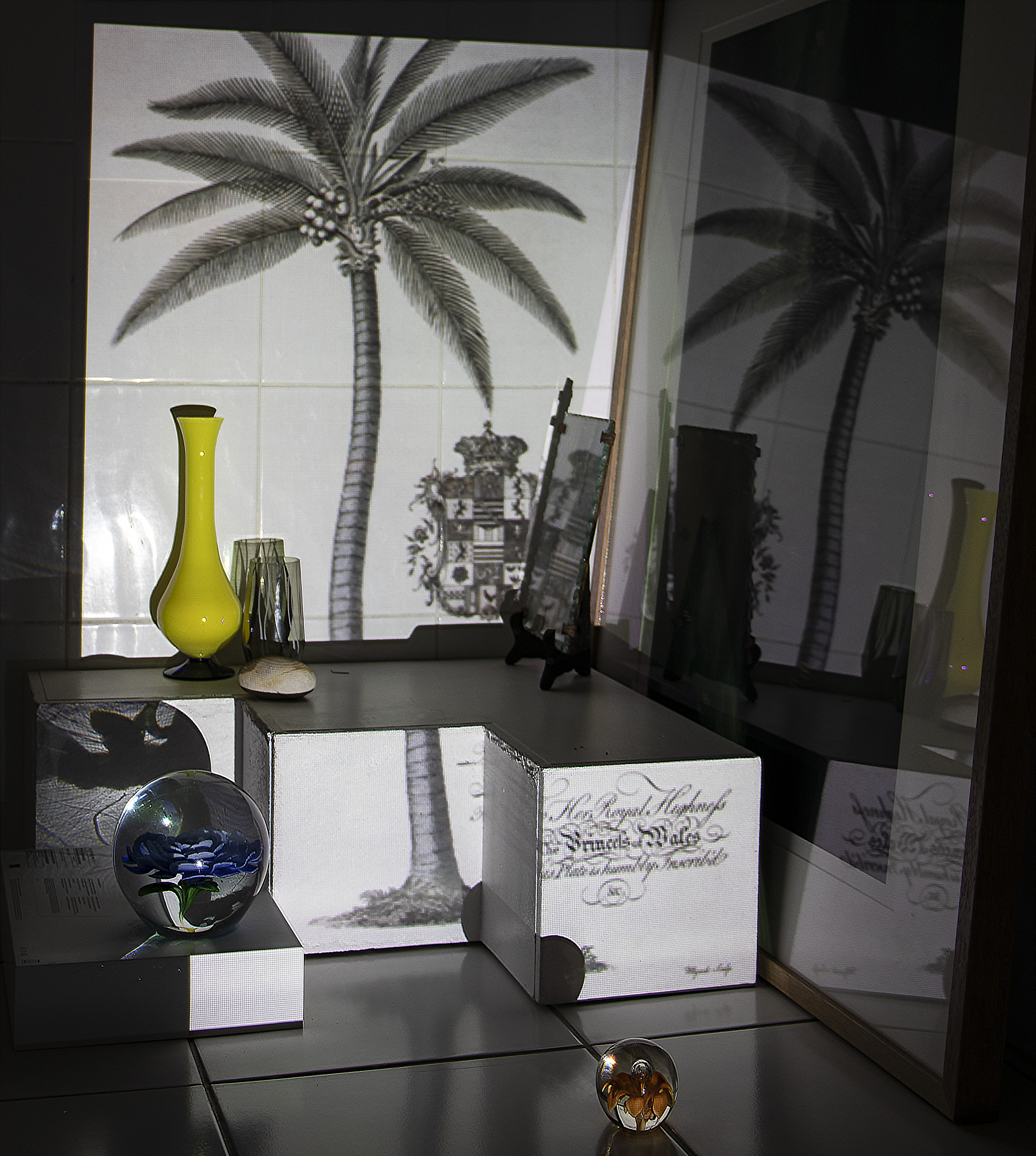 In my current practice, the curation of the objects becomes quite important – as I have learnt through experimentation – that carefully placed coloured glass objects also cast unusual shadows onto the back wall. This allows me to move from the original photograph and build a sculptural set of layers and possibilities within the new work.