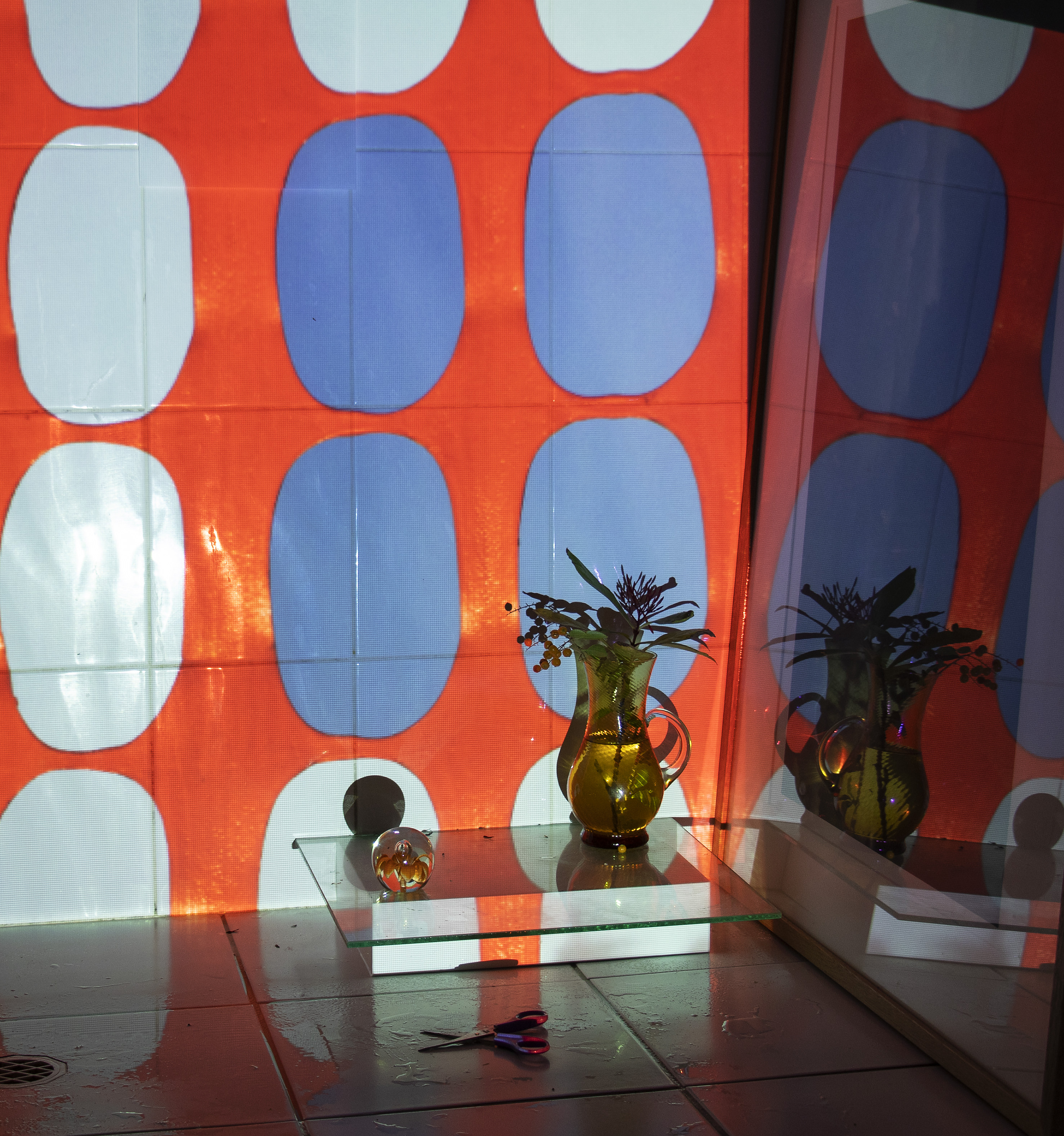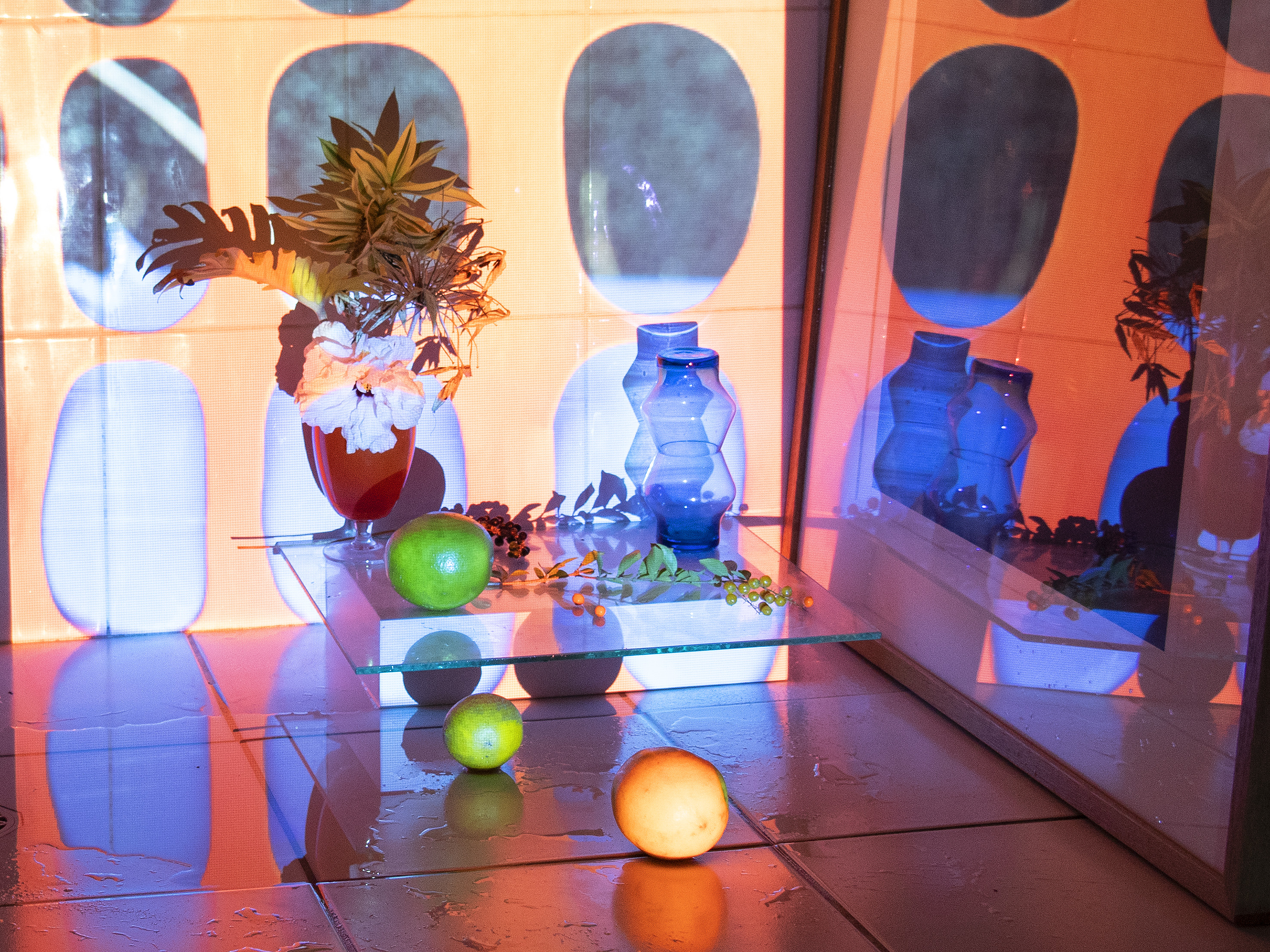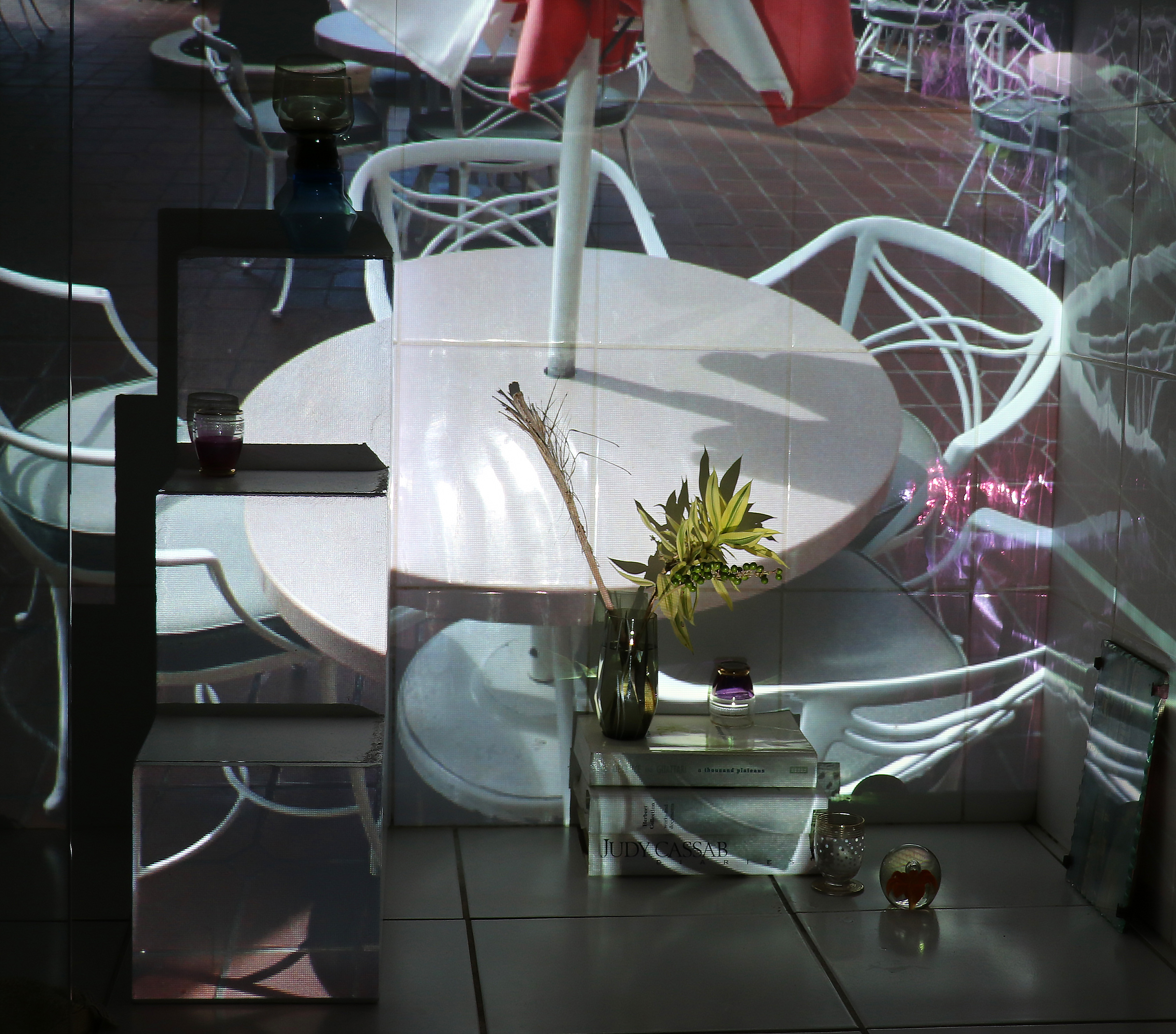 I capitalised on the reflective potential of a larger piece of glass on the right-hand side of the composition, thus creating a sense of replicating the projected image and objects in the final shot.