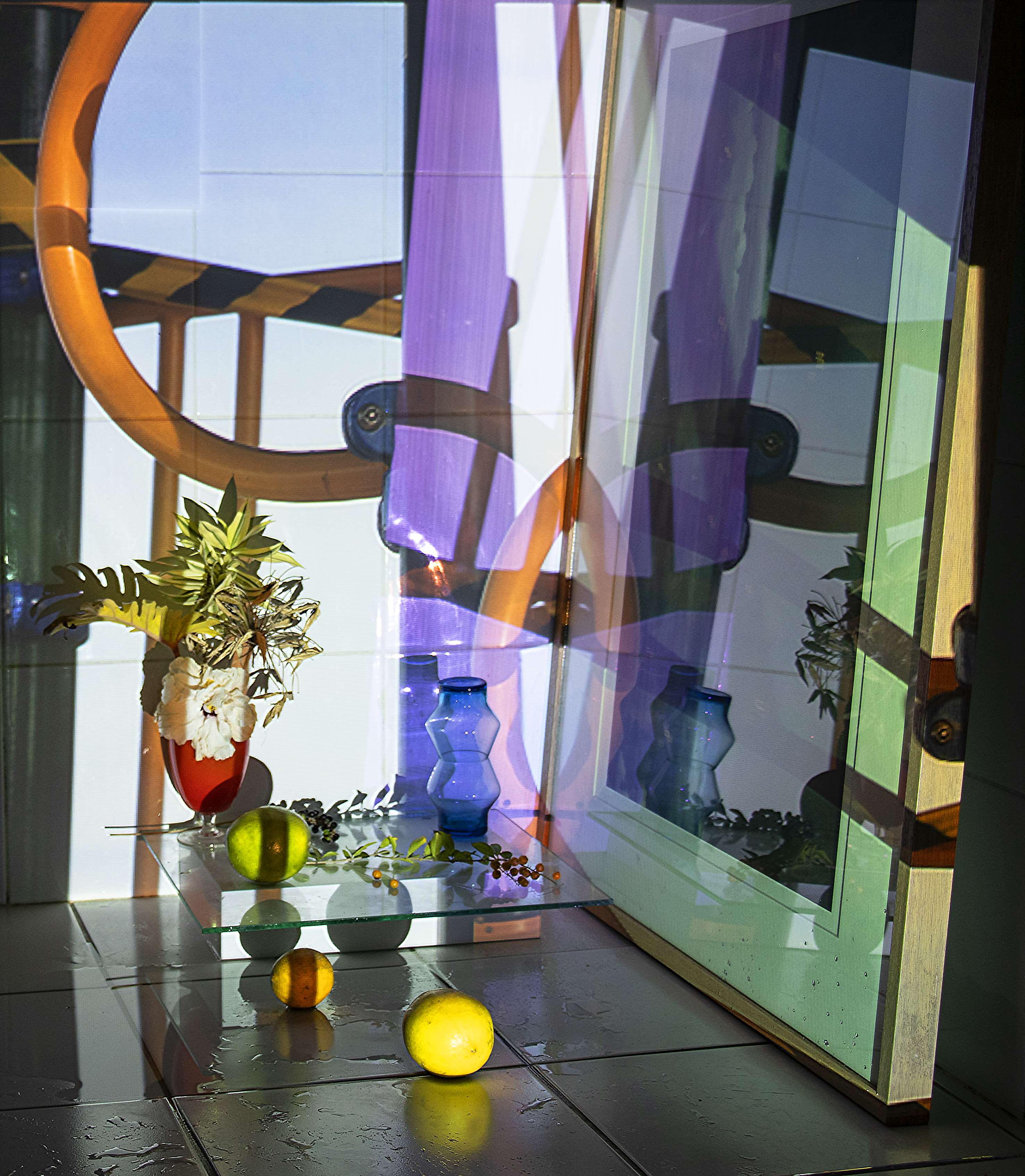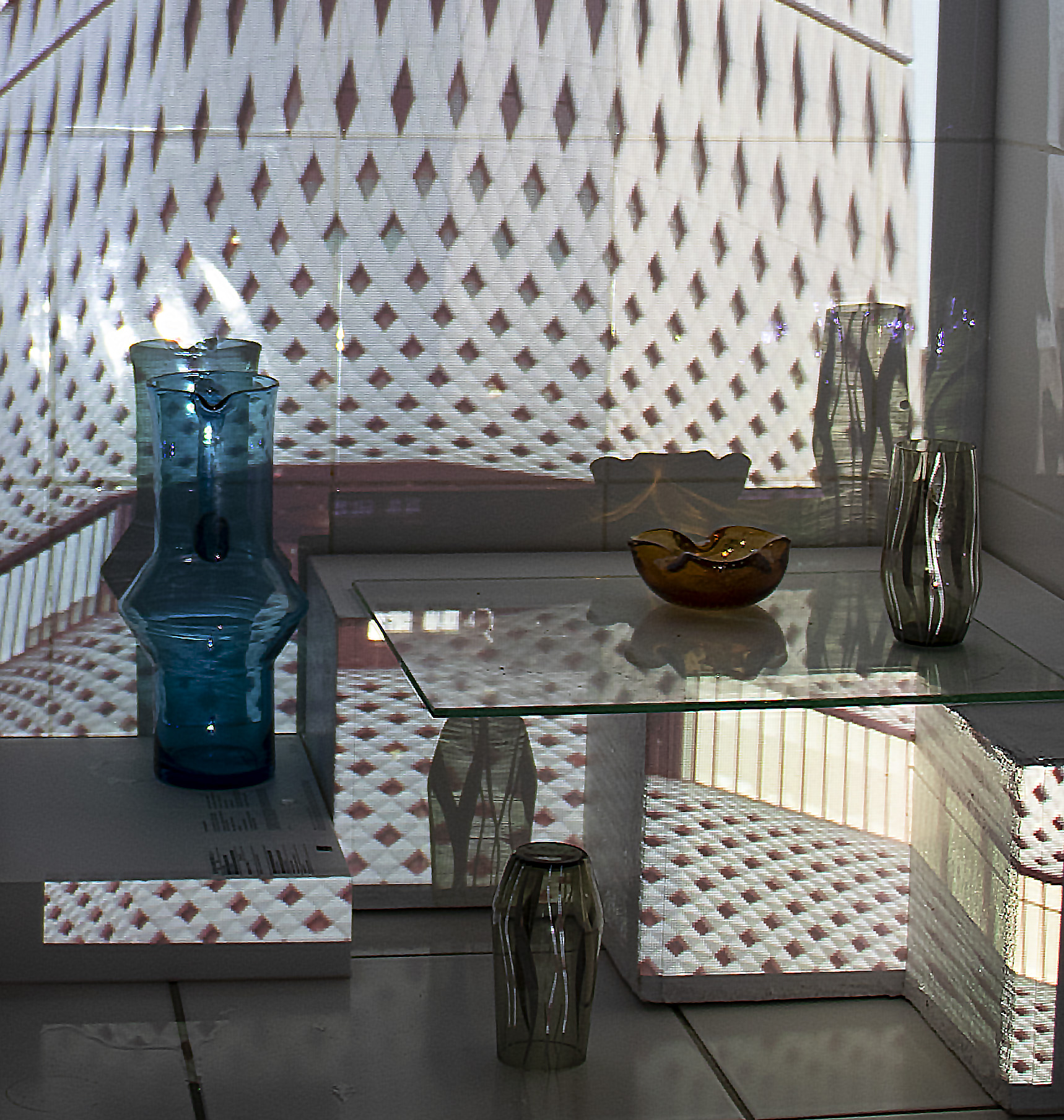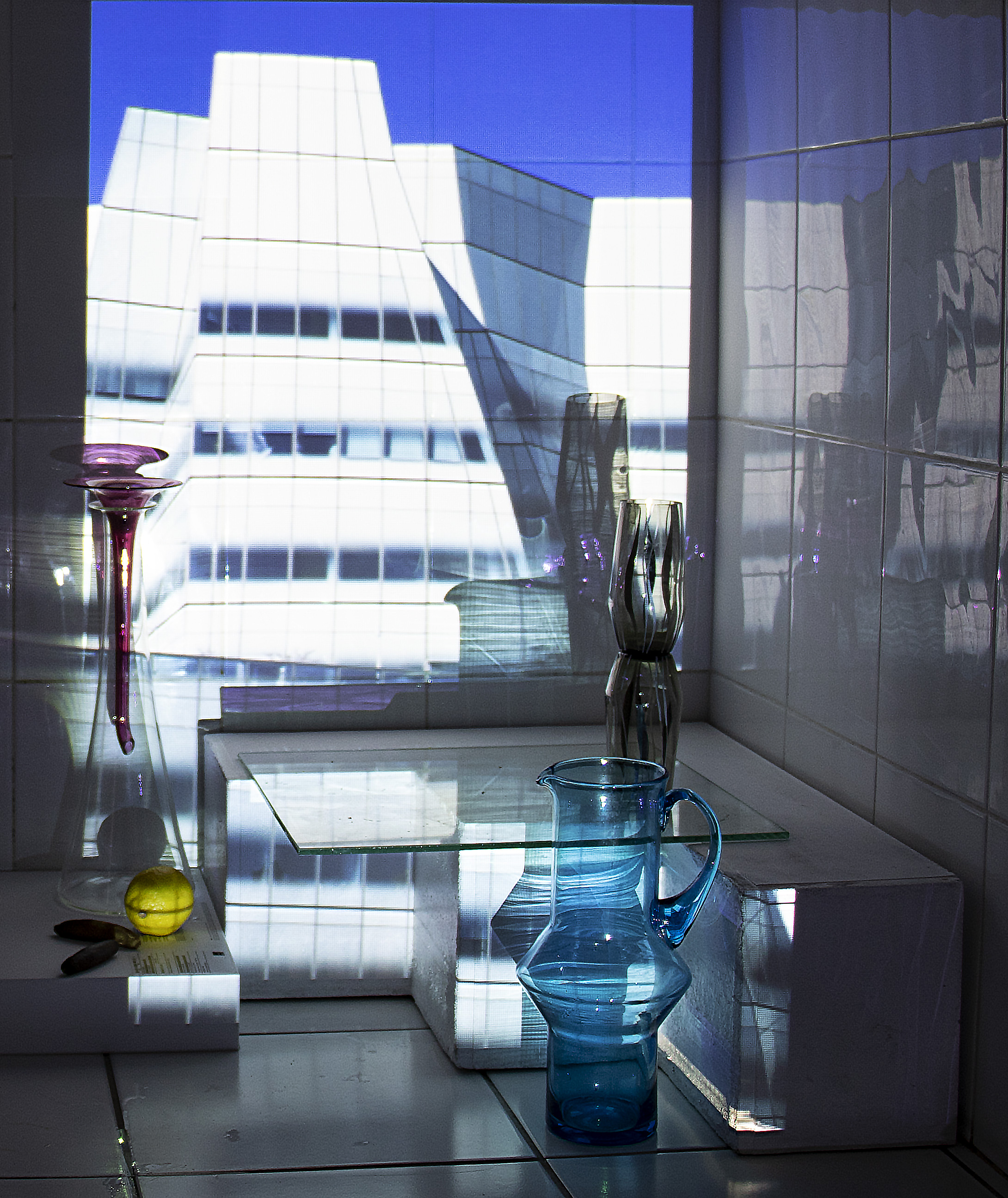 I have purposely used the geometric lines on the floor of the shower to define ground level. Minor adjustments to the height of the tripod and camera can lead to significant differences in how the colours of the glass objects cast their reflections and shadows.