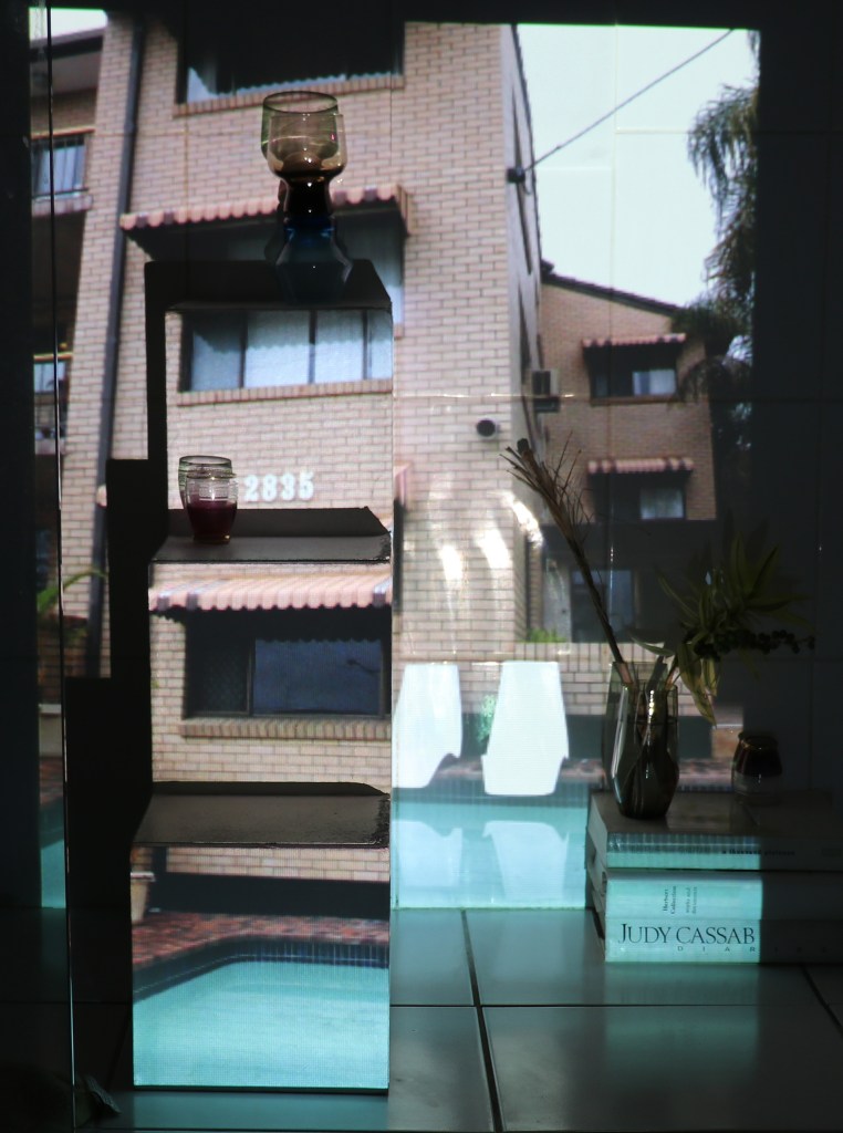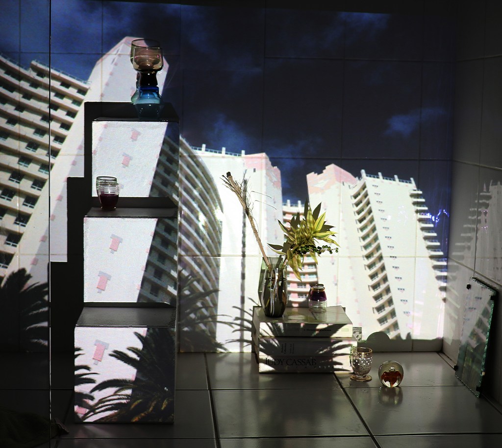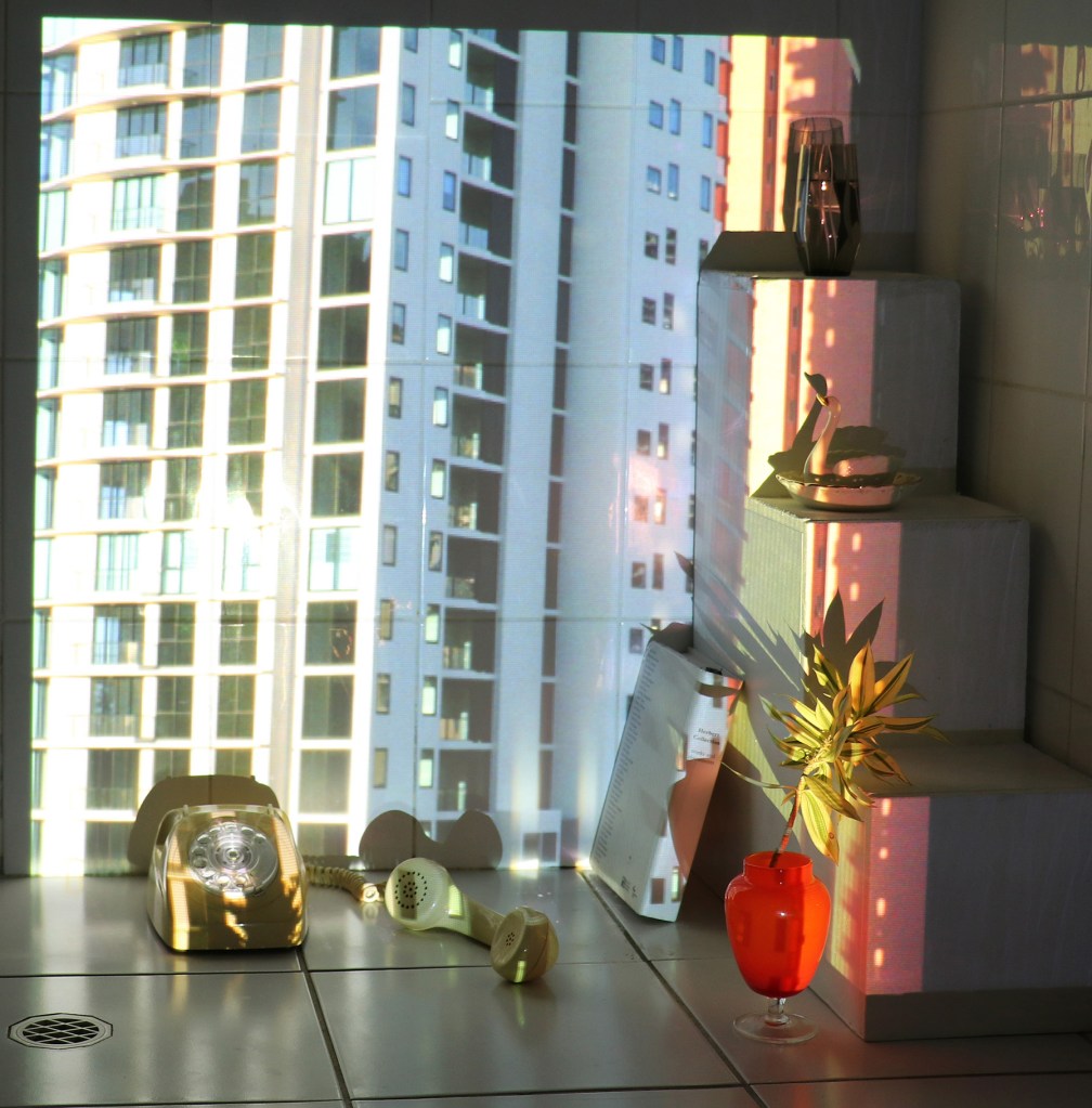 Studio Bathroom extended my practice by developing work that utilises reflective surfaces within high rise apartments and how these can be transformed. I built installations within my bathroom, projecting my images based on other cultural settings and sites and then photograph these. The projections overspilt onto other surfaces and domestic objects as a way of acknowledging that there was still a bigger world out there.
